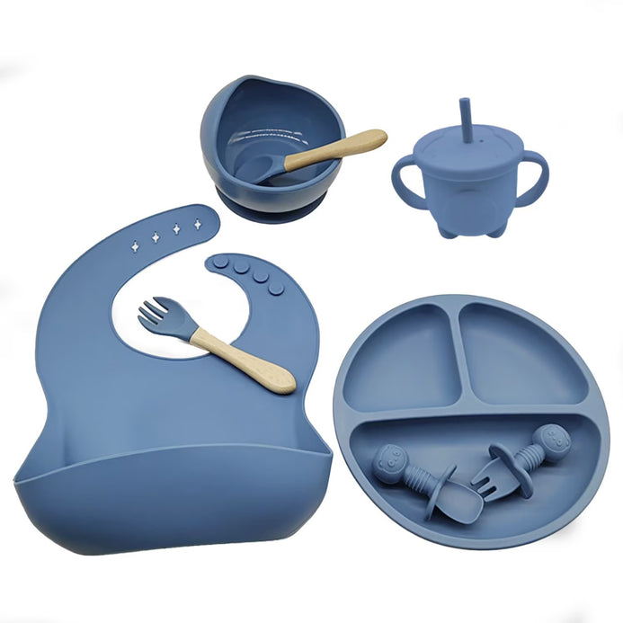 Set 8 piese hranire bebelusi pentru diversificare, farfurie si bol cu ventuze, cana cu capac si pai, lingurita, furculita, baveta din silicon, Albastru