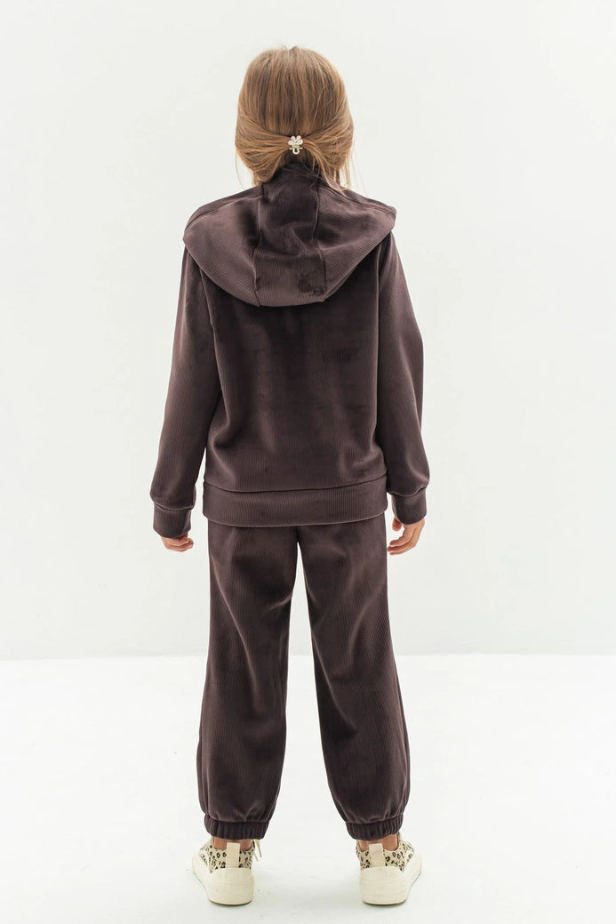 Compleu casual din catifea, pentru fetite, format din hanorac cu gluga si completat de pantaloni lungi cu elastic in talie.