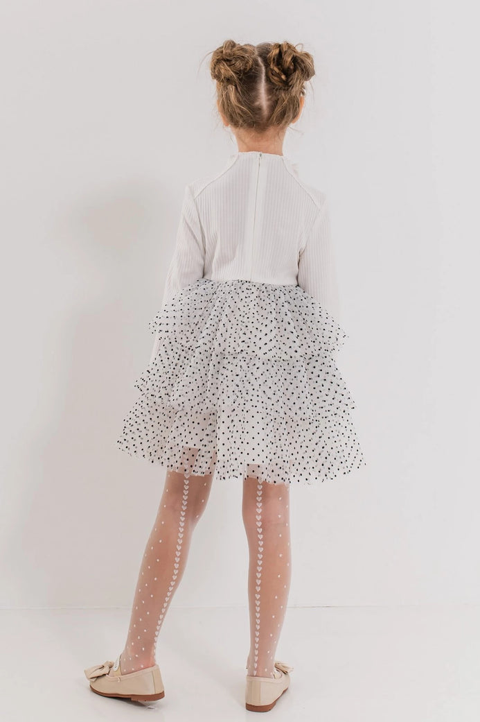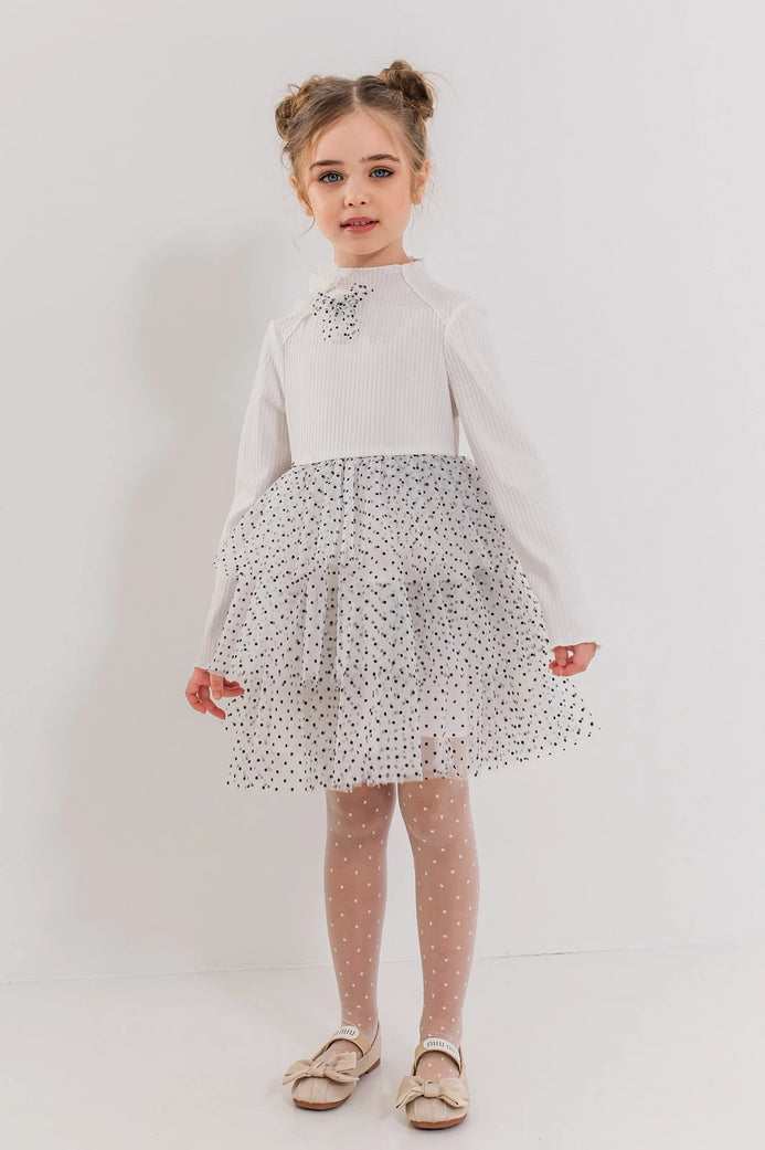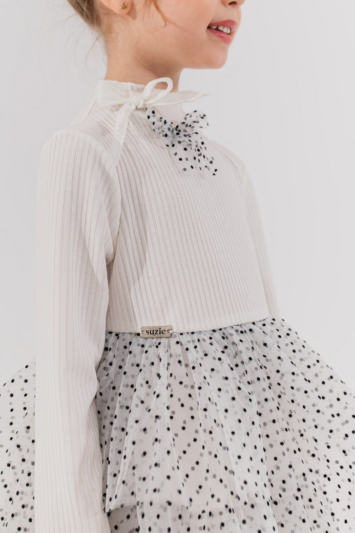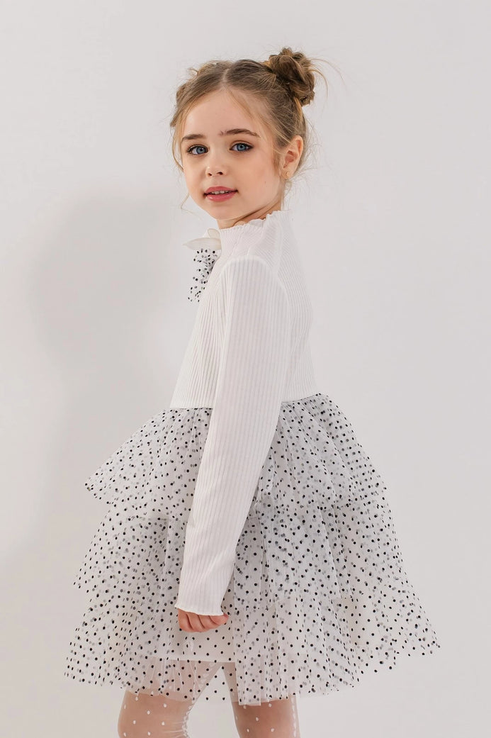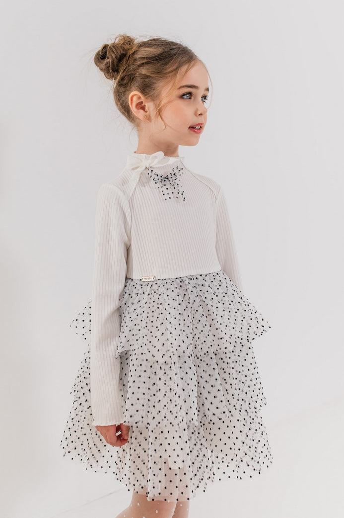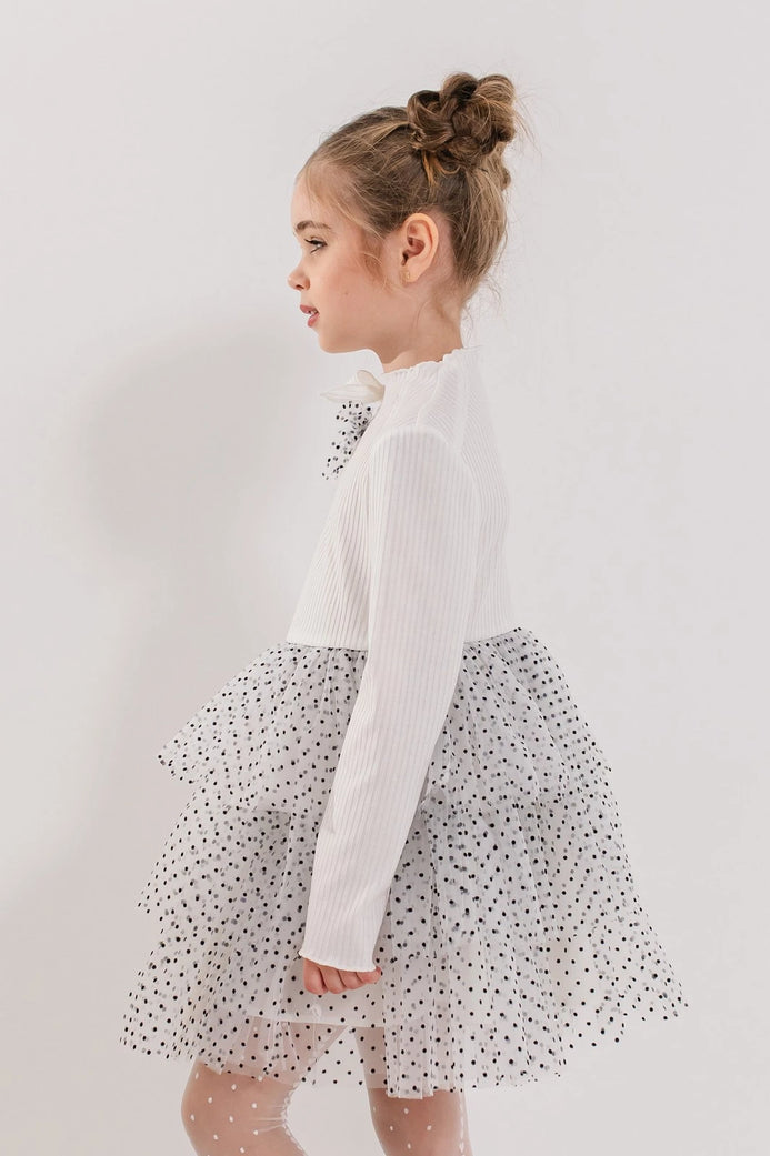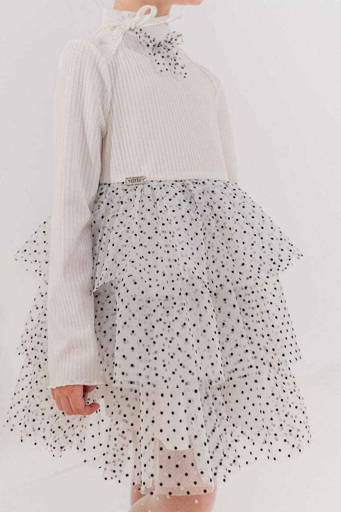 Bumbac fin, tulle delicat și imprimeu cu buline - o rochiță potrivită pentru orice ocazie! Descoperă farmecul clasic al rochiei Varvara, creată special pentru fetițele care iubesc să strălucească și să se simtă confortabil. Cu un model diafan, această rochie combină stilul elegant cu o notă jucăușă datorită modelului cu buline contrastante. Partea superioară este realizată din bumbac fin texturat iar fusta amplă din tulle, în straturi, creează un efect de volum grațios.