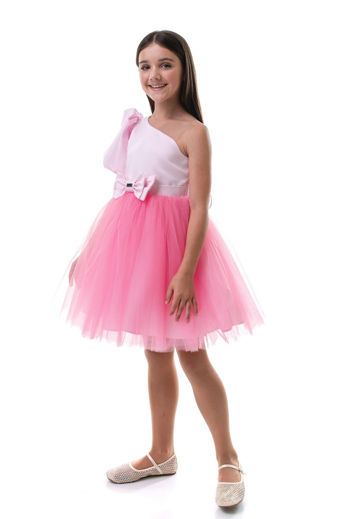 ROVENA - Rochie de ocazie din saten cu tulle fin si model asimetric pe un umar, roz