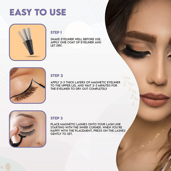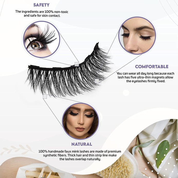 Descopera cele 5 modele de gene false magnetice din pachet, cu eyeliner magnetic si penseta-aplicator! Genele magnetice nu necesita adezivi, sunt usor de aplicat si nu deterioareaza genele naturale. Modele din pachet sunt potrivite oricarei fizionomii, indiferent de tipul de machiaj dorit sau de ocazie. Tusul special contine particule magnetice ultra-fine iar genele au 5 magneti pe banda cu care se fixeaza usor si sigur. Tot ce trebuie sa faci este sa trasezi o linie de tus, sa astepti sa se usuce si sa aplici genele, folosind penseta. La sfarsitul utilizarii, genele se indeparteaza (se pastreaza pentru urmatoarea utilizare) iar tusul se sterge cu ajutorul unei dischete sau servetel demachiant.