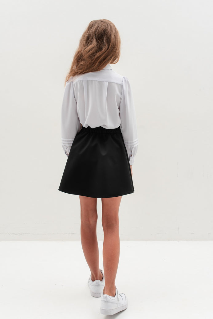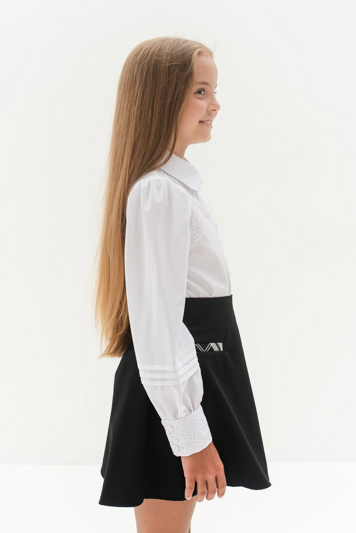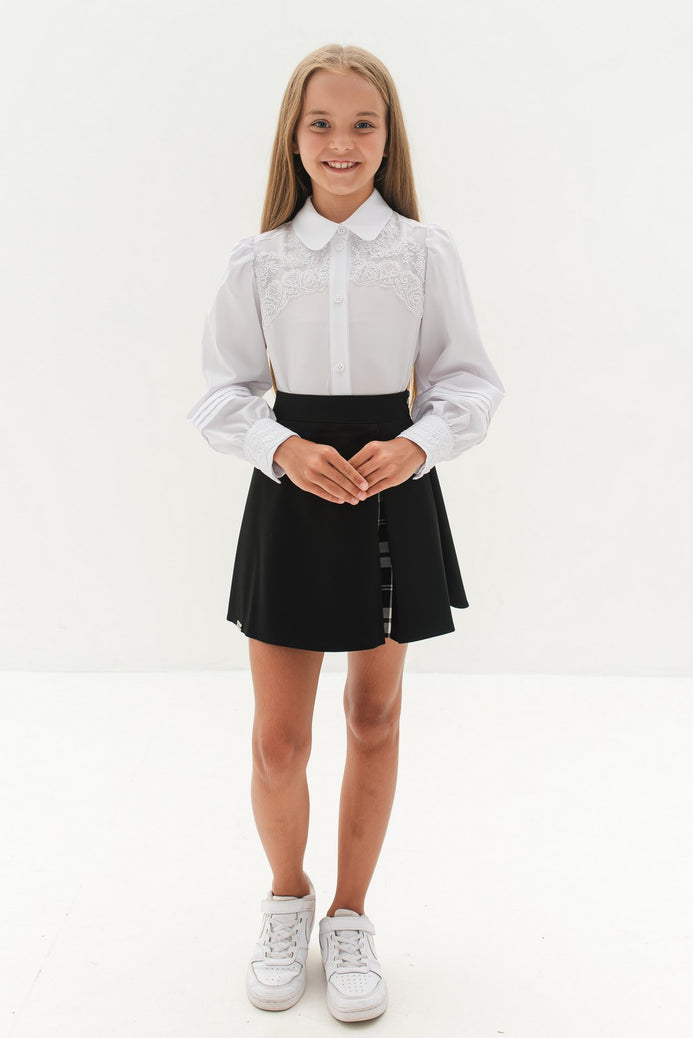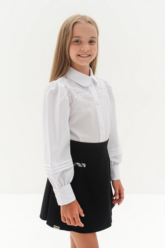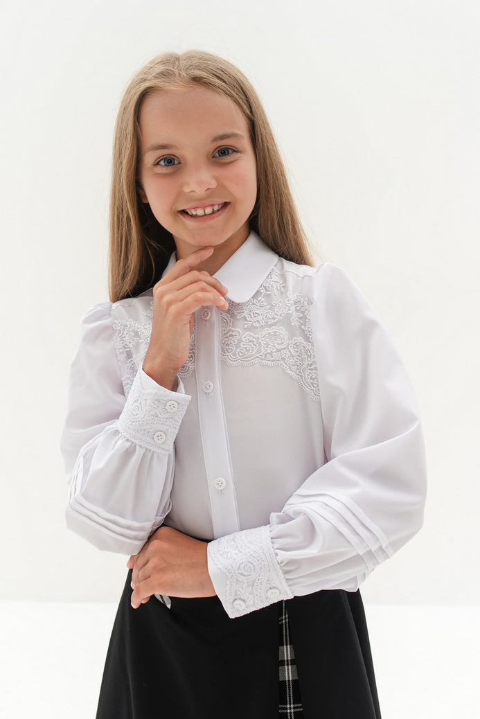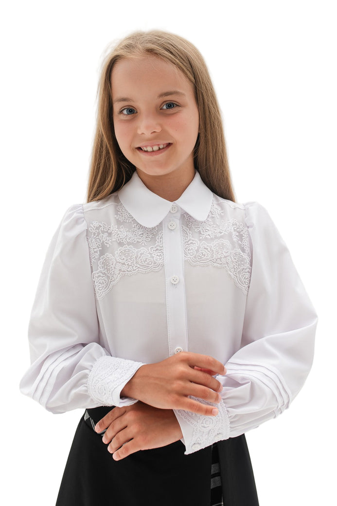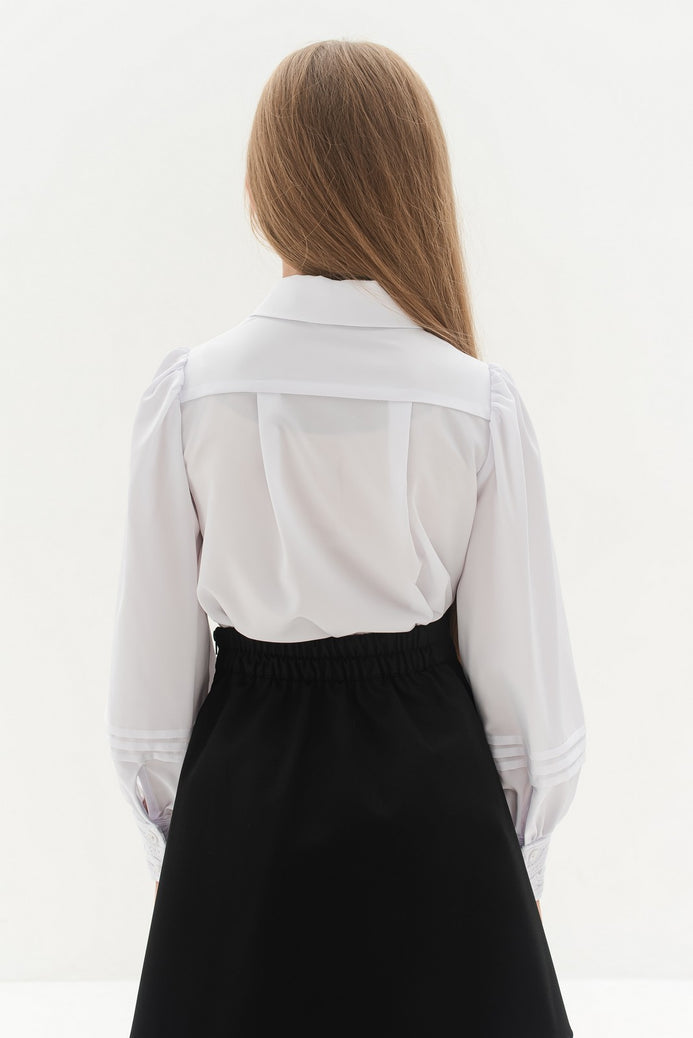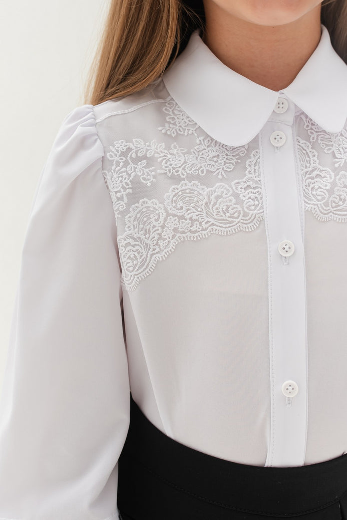 Camasa alba cu dantela fina si maneci bufante, eleganta si deosebita, potrivita pentru uniforme scolare sau evenimente speciale.