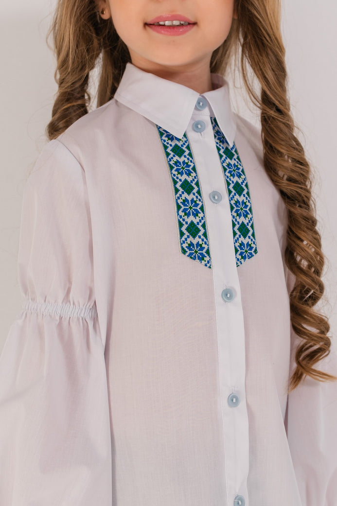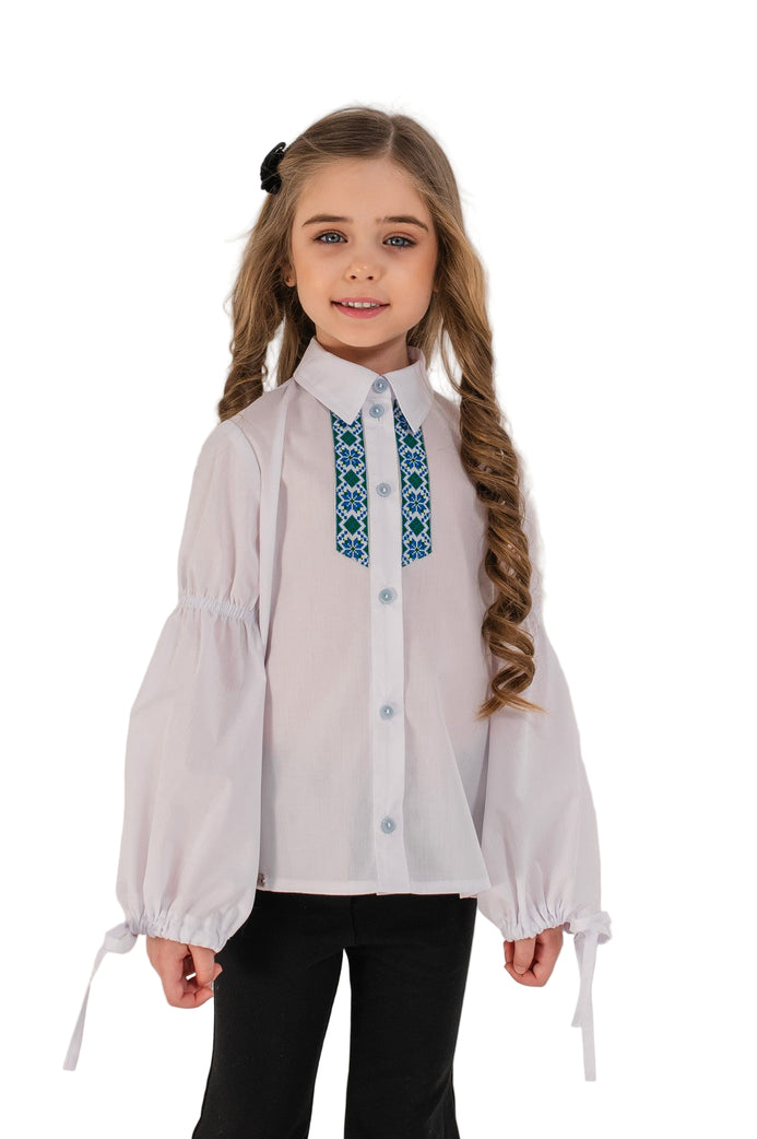 Bluza alba din bumbac cu broderie traditionala si maneci evazate, perfecta pentru uniforme scolare si evenimente festive.