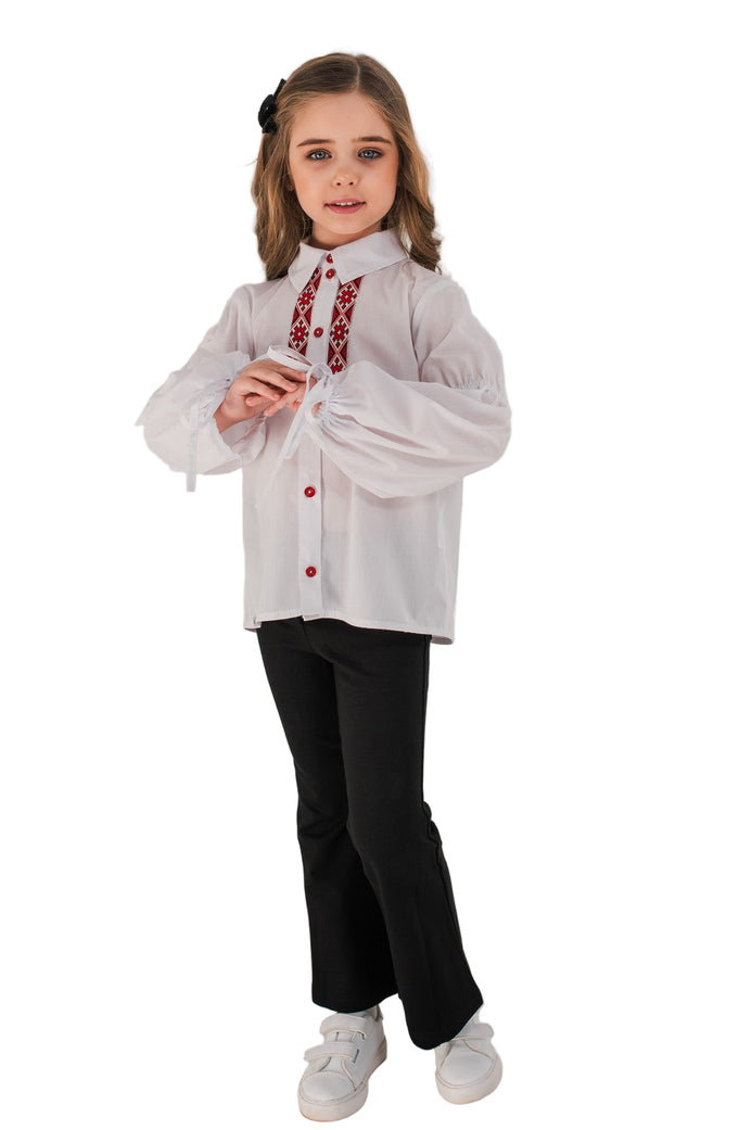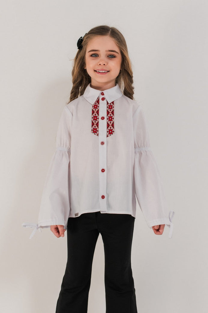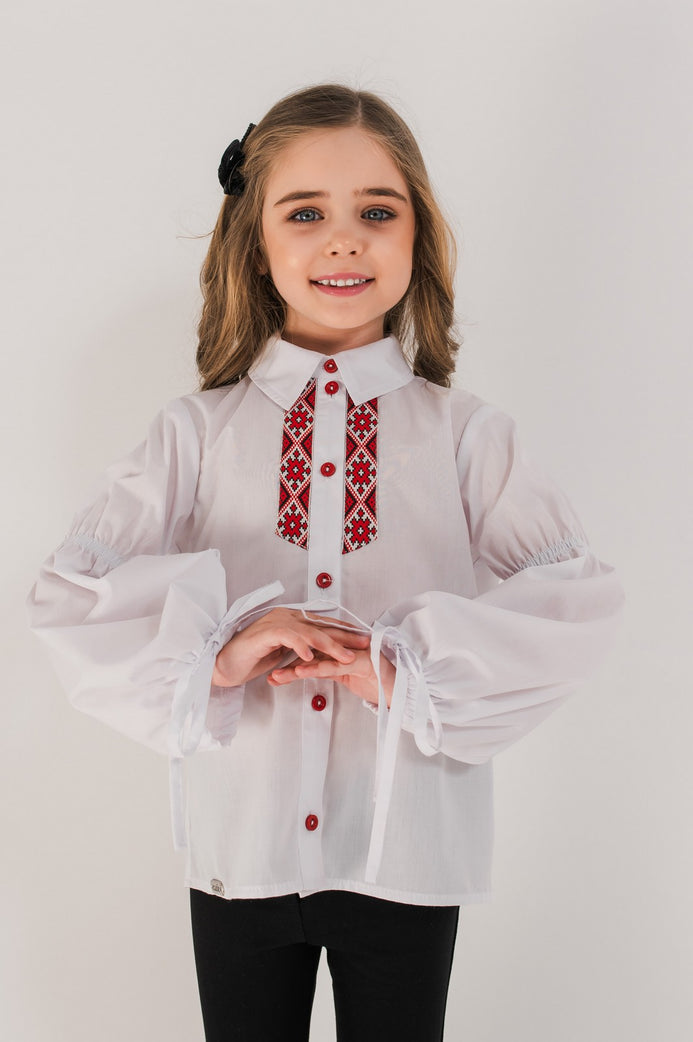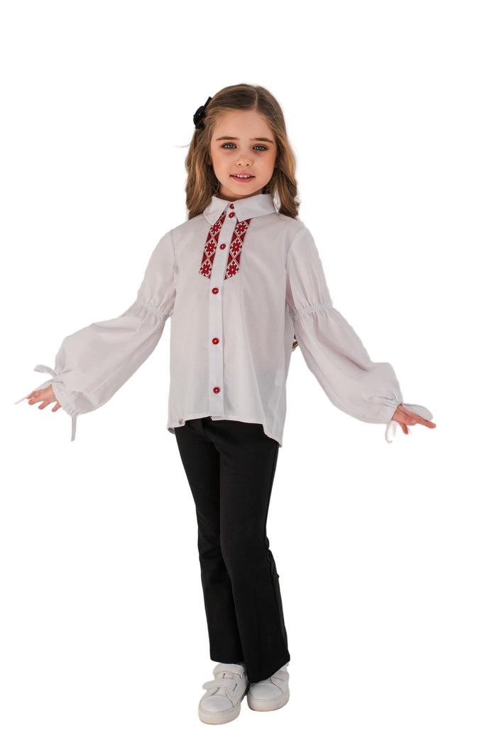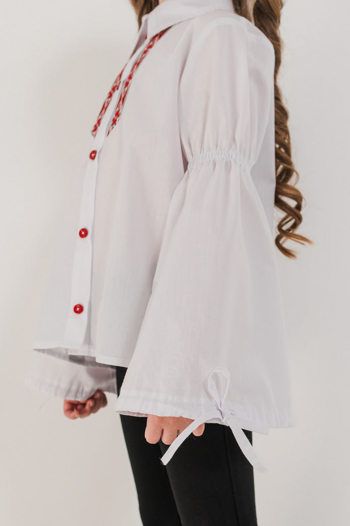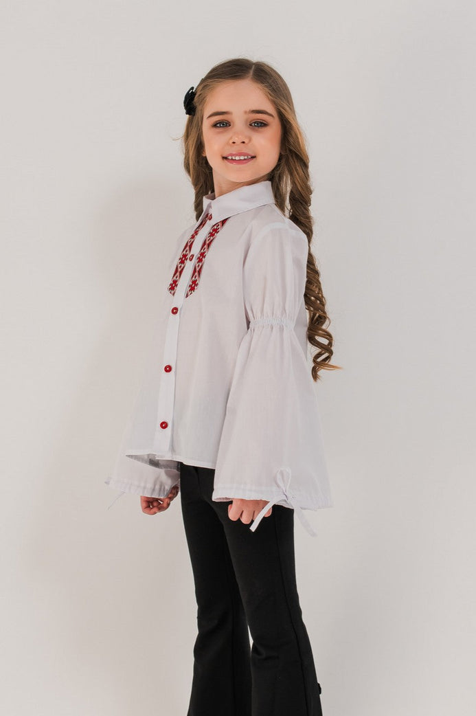 Bluza alba din bumbac cu broderie traditionala si maneci evazate, perfecta pentru uniforme scolare si evenimente festive.