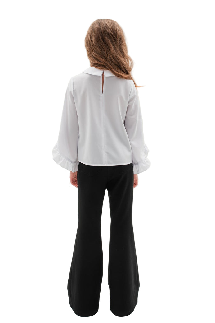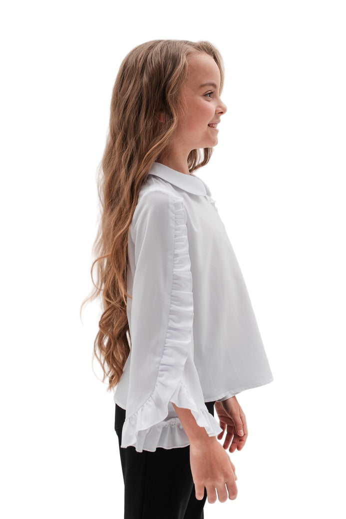 Bluza alba pentru fete cu volane delicate si maneci evazate este ideala pentru tinute scolare.