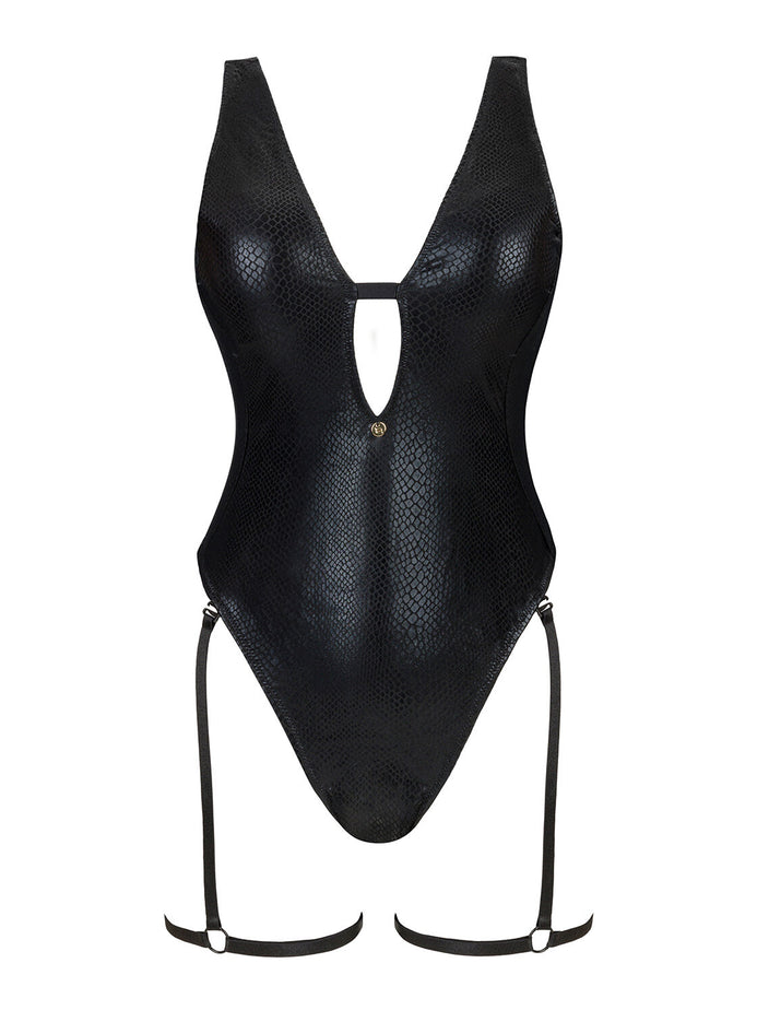 Costum de baie întreg Punta Negra - body sexy cu aspect lucios, decupaje și accesorii seducătoare, animal print negru