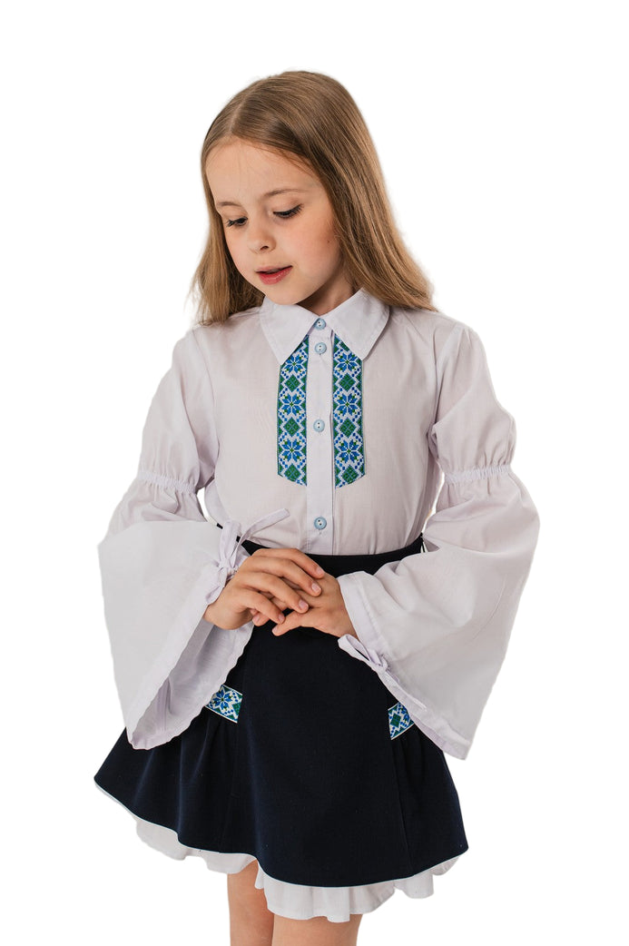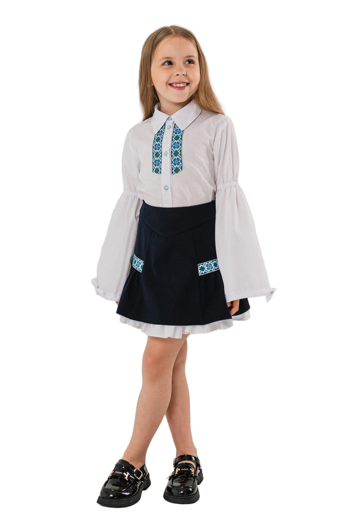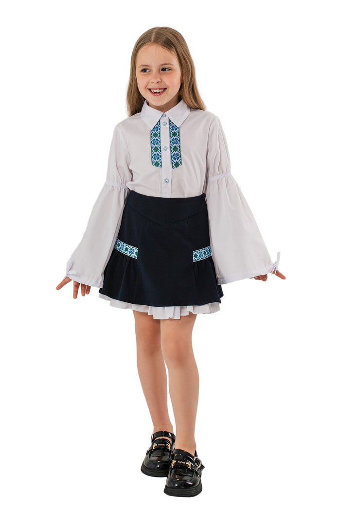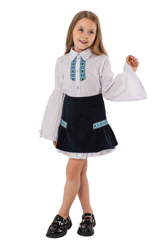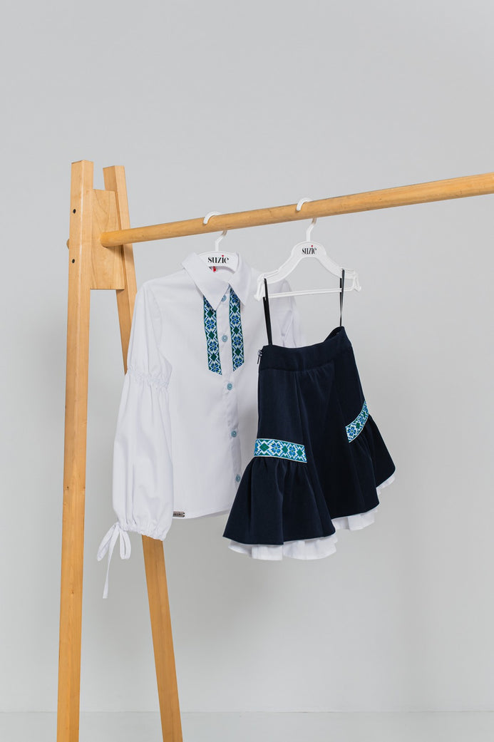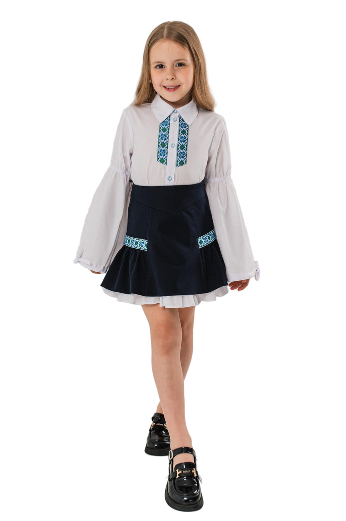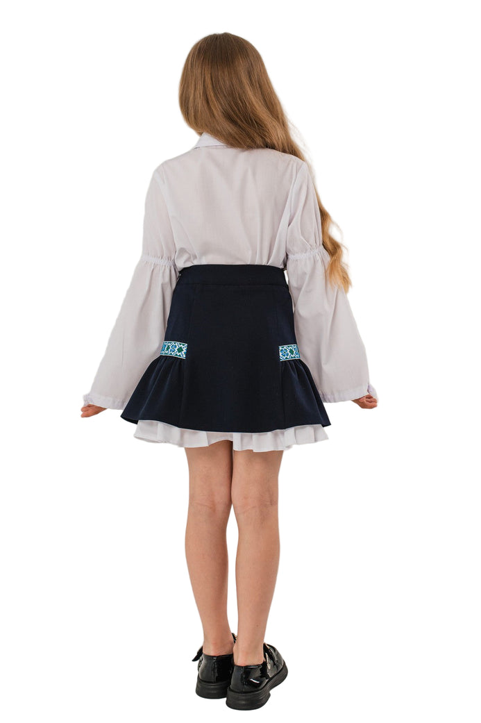 Fusta bleumarin pentru fete cu motive traditionale, broderie si volan alb in contrast.