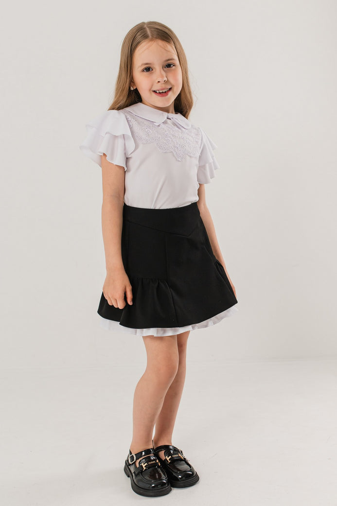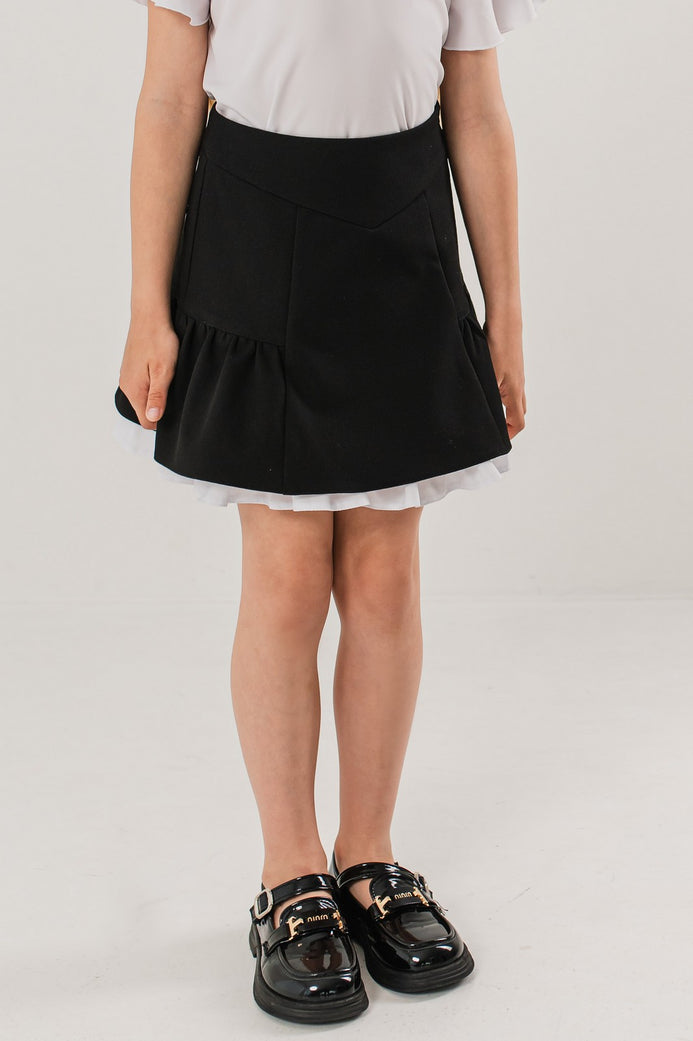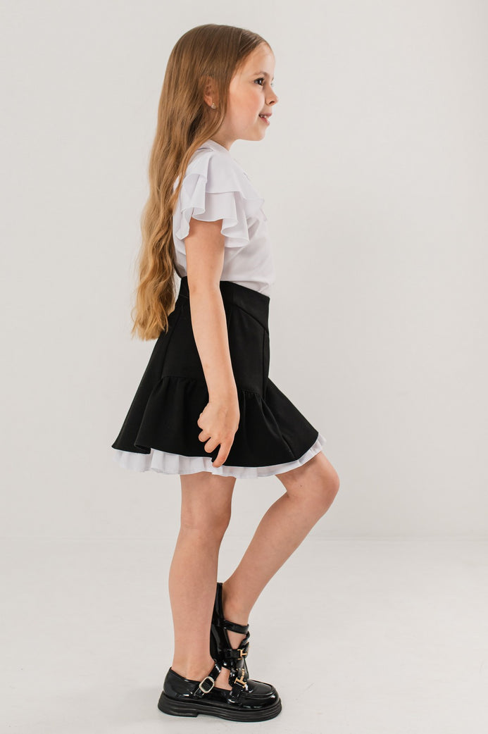 Fusta neagra pentru fete cu volan alb in contrast si croiala eleganta.