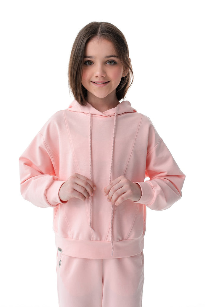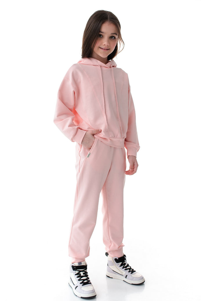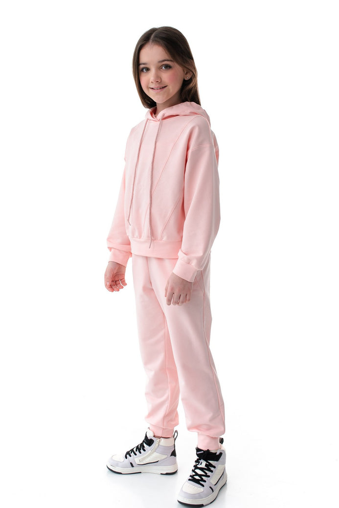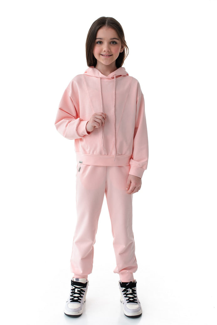 Compleu sport din bumbac premium pentru fetite, format din hanorac cu gluga si completat de pantaloni cu elastic in talie.