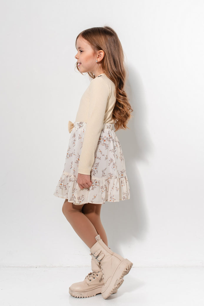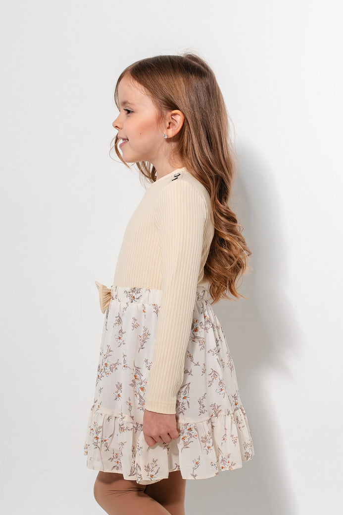 O rochie de zi cu zi, cu un model lejer, perfectă pentru primăvară, toamnă sau zilele răcoroase de vară. Modelul rochiei Keiko îmbină confortul bumbacului moale, tip canalé (ribbed) cu delicatețea voalului floral, pentru un look versatil, jucăuș și elegant. Partea superioară este confecționată din bumbac plăcut la atingere și ușor elastic, cu mâneci lungi și croială simplă. Fusta este vaporoasă, realizată din voal dublat, cu volane delicate și un imprimeu floral pastelat care aduce o notă romantică ținutei. Talia este decorată cu o fundiță asortată, pentru un plus de rafinament.