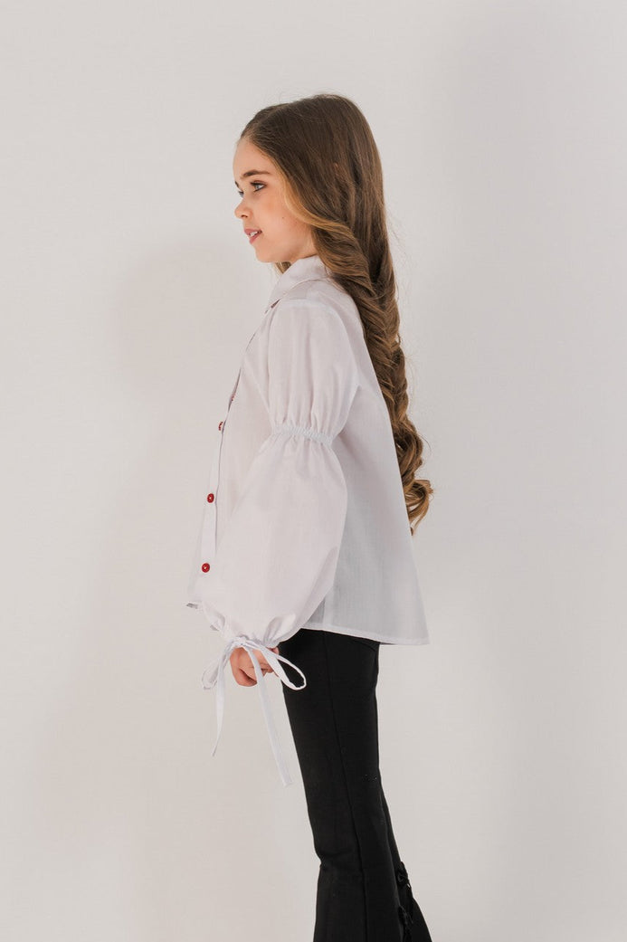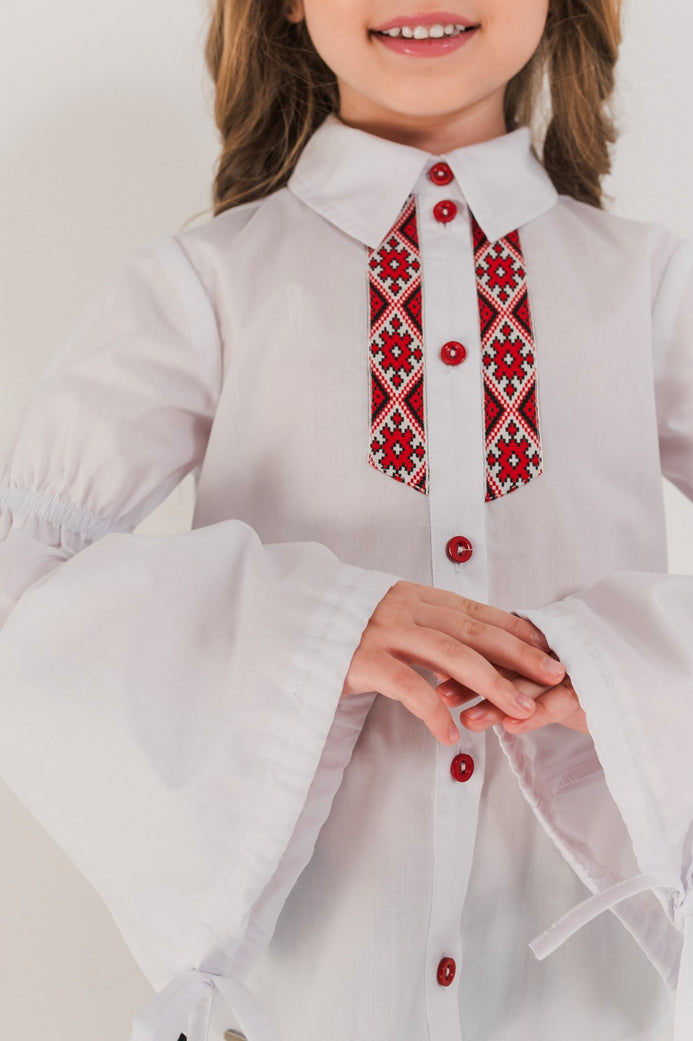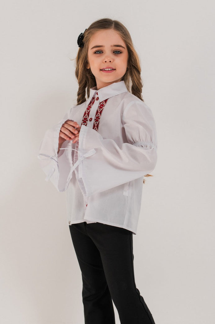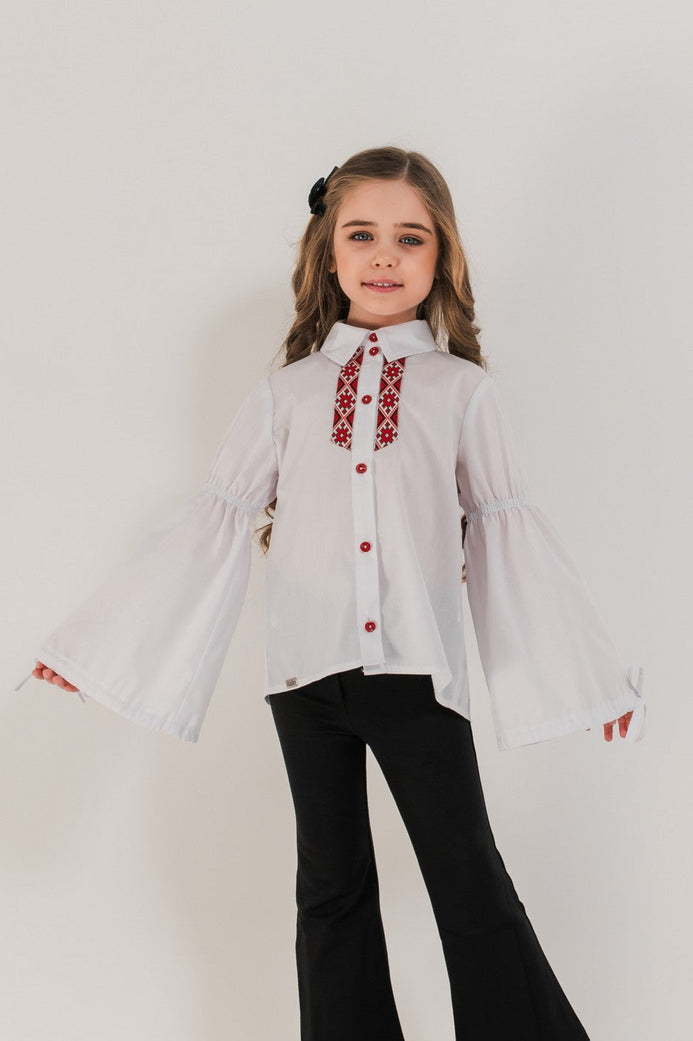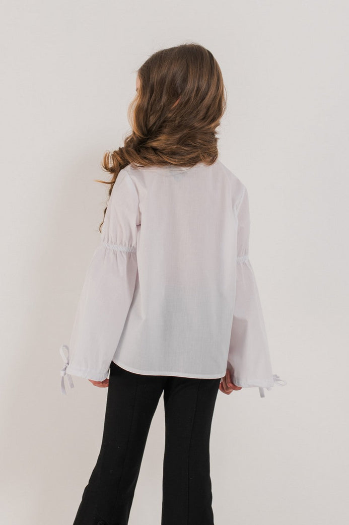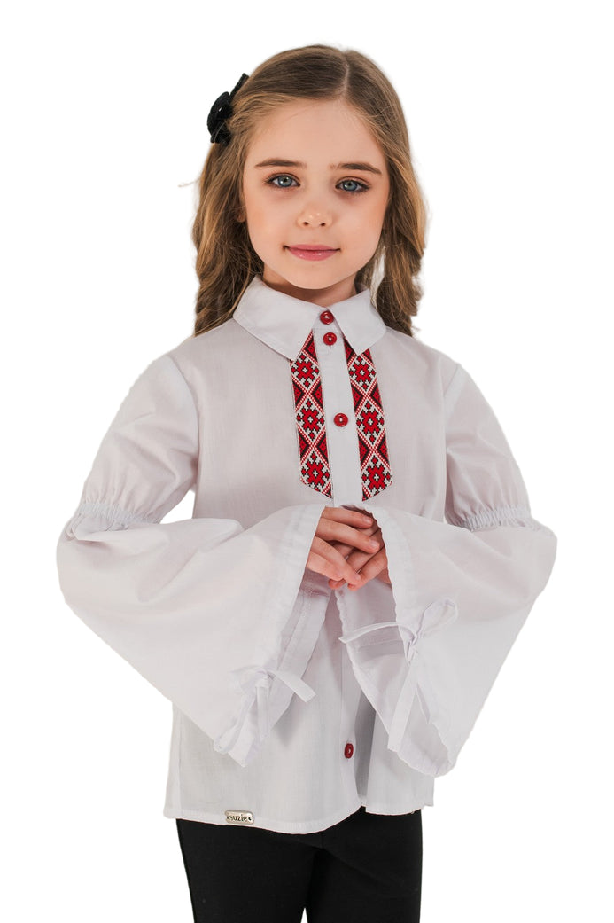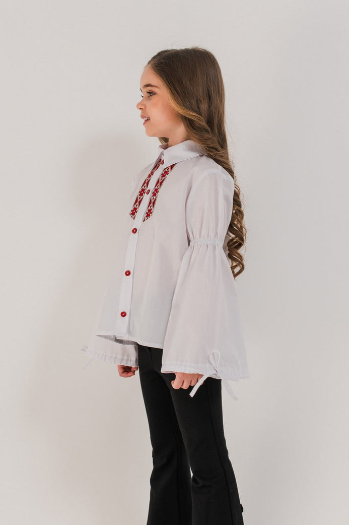 Bluza alba din bumbac cu broderie traditionala si maneci evazate, perfecta pentru uniforme scolare si evenimente festive.