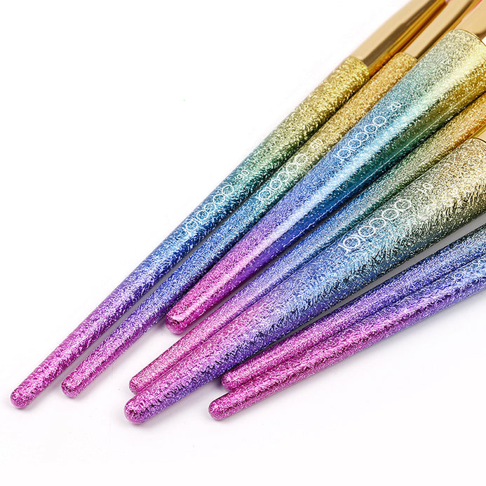 Setul de pensule Fantasy Color Makeup cuprinde 10 pensule pentru machiaj. Este un set deosebit de versatil, cu design inspirat de frumusetea culorilor curcubeului si din magia acvatica a misterioaselor sirene. Sunt pensule cruelty-free pentru fata, ochi si buze, realizate din fibre sintetice. Finisajele de inalta calitate cuprind inele de prindere din aluminiu auriu si manere multicolore. Fibrele moi, de calitate premium se potrivesc pentru texturile pudrate sau cremoase ale fardurilor si ofera posibilitatea unei aplicari profesionale a machiajului de zi cu zi. Setul se prezinta intr-un ambalaj elegant iar fiecare pensula din interior este ambalata individual.