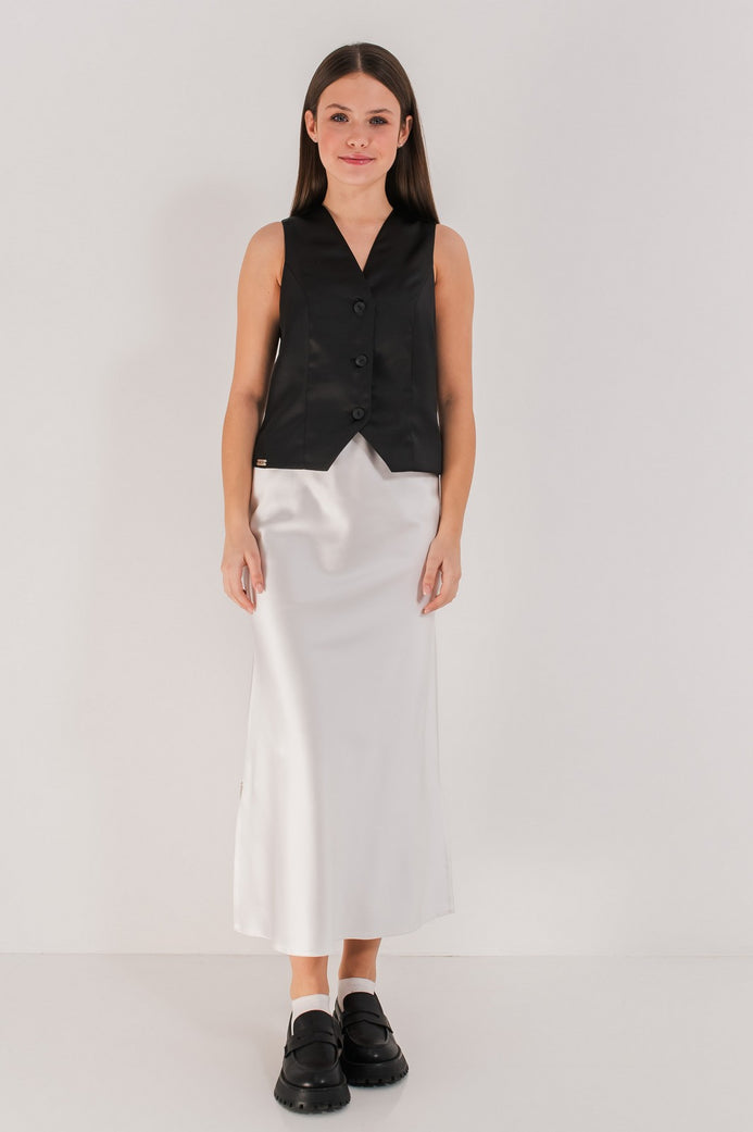 Vesta completeaza perfect tinuta de scoala si nu trebuie sa lipseasca din garderoba fetitelor. Croiul semi-ajustat si cusaturile fine subliniaza talia, iar decupajul frontal in V adauga eleganta. Inchiderea cu nasturi ii ofera un plus de functionalitate iar materialul fin pastreaza forma si aspectul impecabil chiar si dupa purtari multiple. Poate fi purtata peste camasi sau bluze si e poate asorta cu fuste, pantaloni clasici, pantaloni casual si skort. Se potriveste perfect cu modelul de fusta/pantalon Namiri din aceasi gama si se poate forma set cu aceasta.