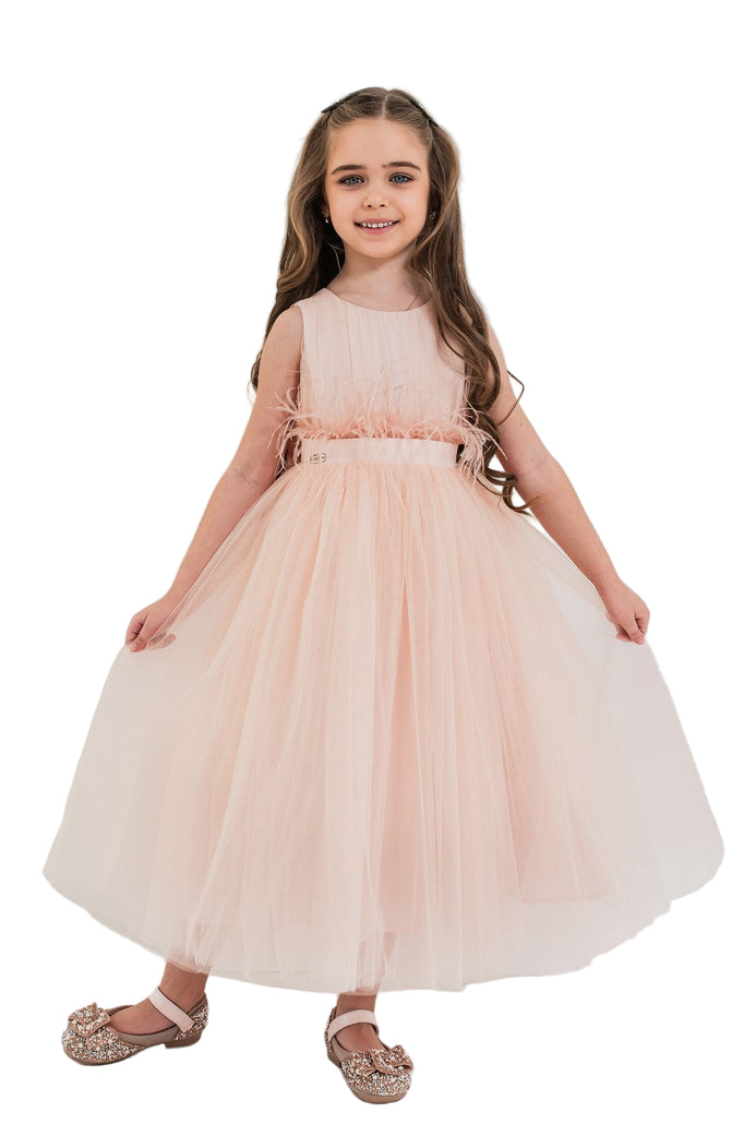 Tulle fin, detalii drapate și un accesoriu elegant în talie – rochia Jasmin este alegerea perfectă pentru micile domnișoare care doresc să strălucească la fiecare eveniment! Un model diafan, realizat cu grijă din materiale premium care oferă confort și rafinament. Rochia este semi-cambrată și are croială amplă, în cloș, cu lungimea fustei până deasupra gleznelor. Corsetul este decorat cu drapaje fine din tulle care adaugă un plus de rafinament ținutei. Linia taliei este accentuată de o bandă din satin cu pene decorative (detașabilă), completată de o fundă care evidențiază frumos silueta. Fusta compusă din cinci straturi de tulle, oferă volum spectaculos iar stratul de saten oferă un plus de strălucire și o notă festivă.