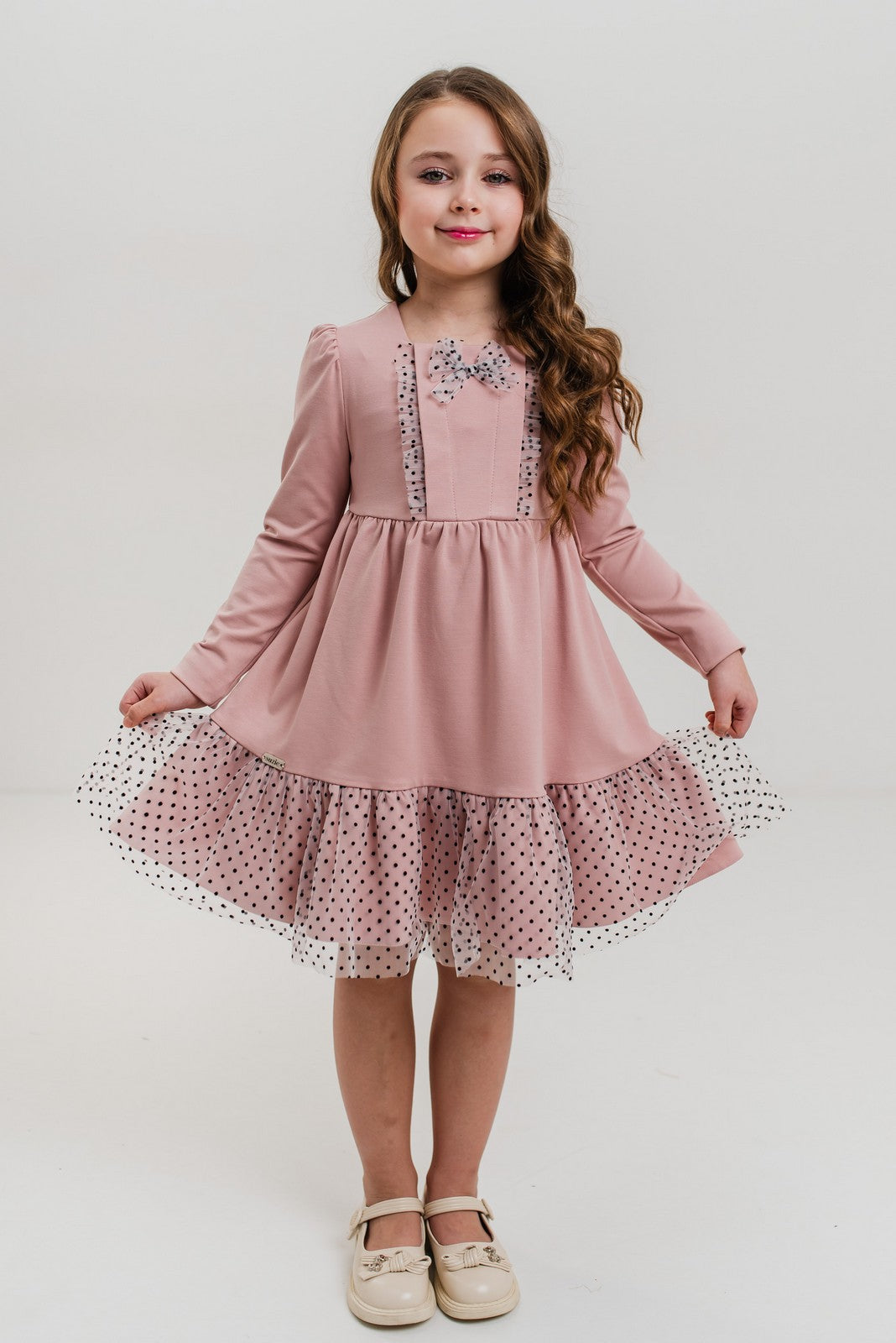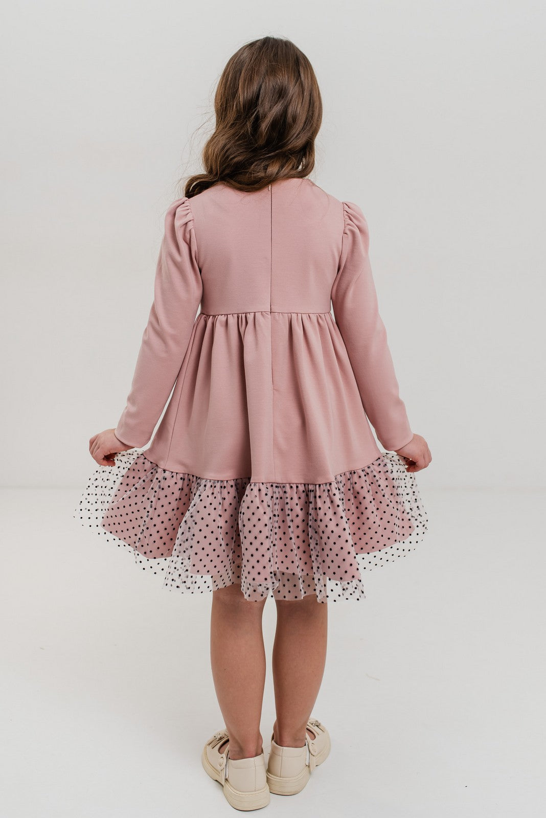 Rochie roz pentru fetite, cu maneca lunga, fusta ampla si detalii decorative din tulle cu buline - model elegant si confortabil, ideala pentru scoala, petreceri sau ocazii speciale.