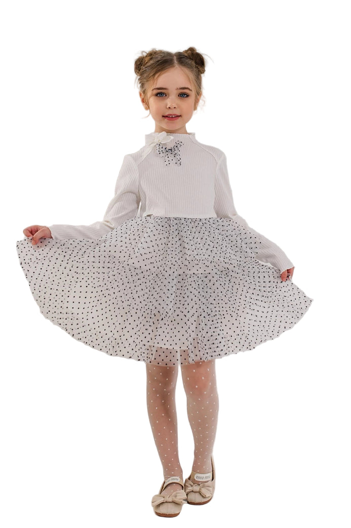Bumbac fin, tulle delicat și imprimeu cu buline - o rochiță potrivită pentru orice ocazie! Descoperă farmecul clasic al rochiei Varvara, creată special pentru fetițele care iubesc să strălucească și să se simtă confortabil. Cu un model diafan, această rochie combină stilul elegant cu o notă jucăușă datorită modelului cu buline contrastante. Partea superioară este realizată din bumbac fin texturat iar fusta amplă din tulle, în straturi, creează un efect de volum grațios.
