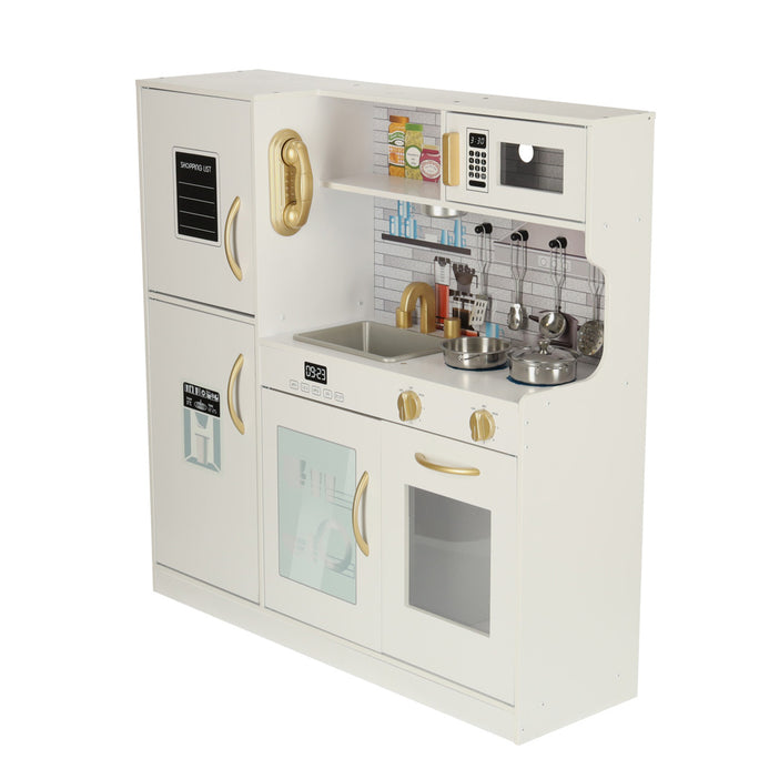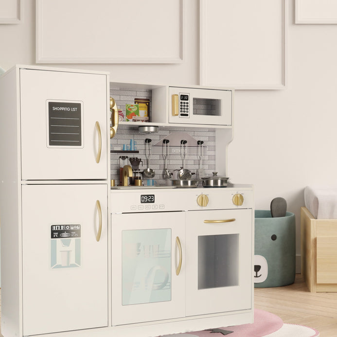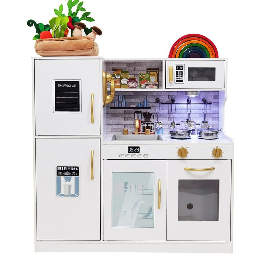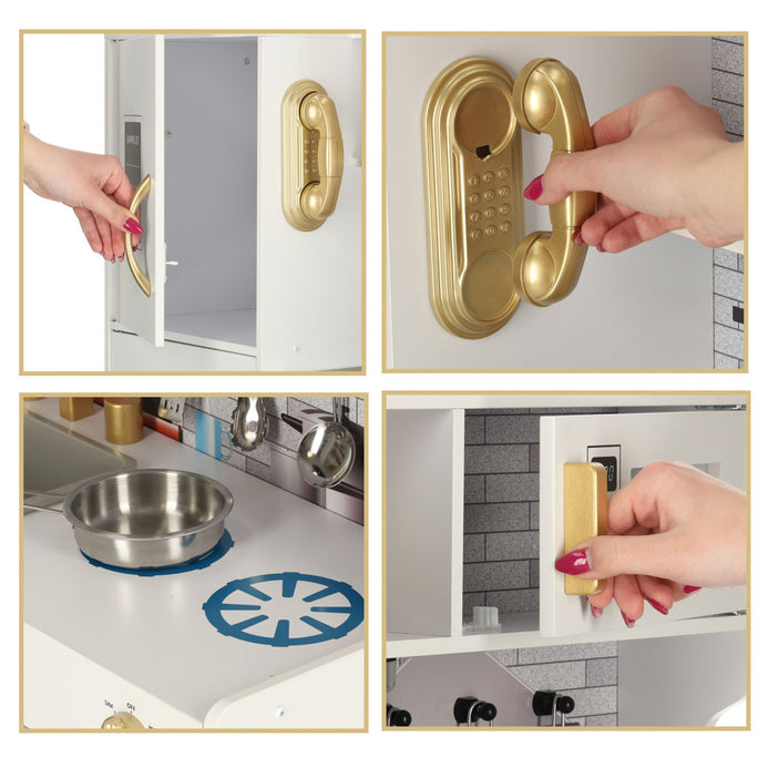 Bucatarie din lemn pentru copii, alba cu detalii aurii, frigider, cuptor si ustensile - Jucarie educativa si sigura, ideala pentru joaca 3+ ani.