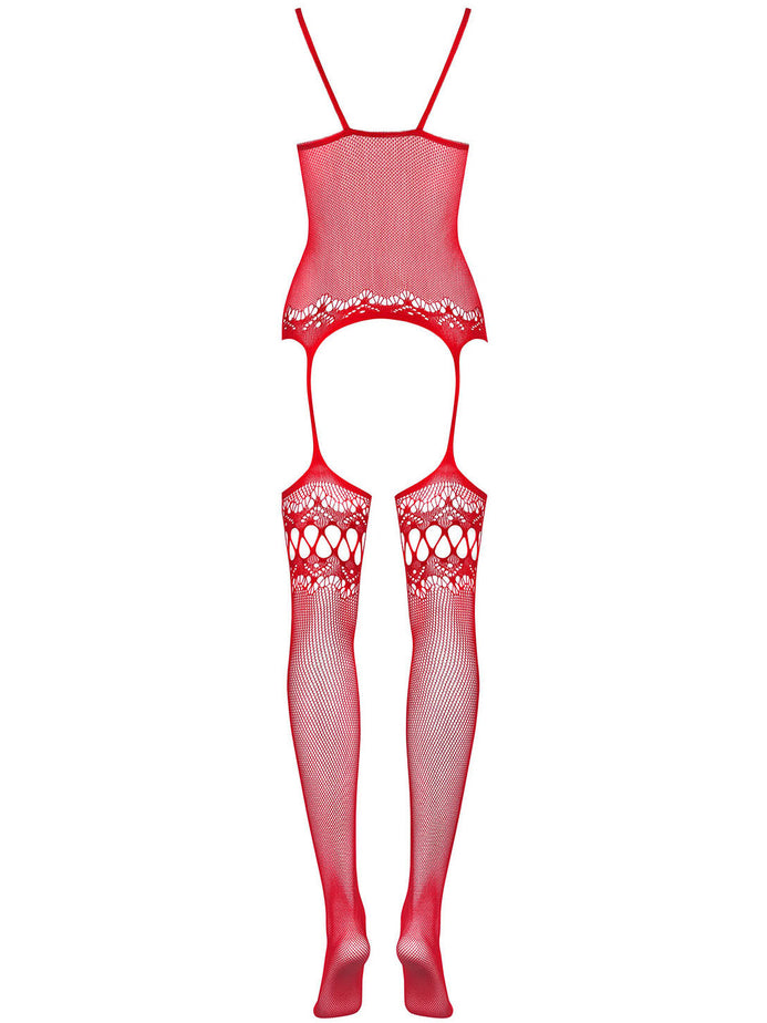 Bodystocking Obsessive F214 - lenjerie erotică din plasă cu portjartier și decupaje S-L (one size), roșu