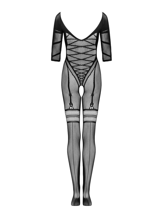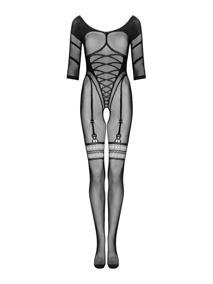 Bodystocking Obsessive F240 - lenjerie erotică din plasă cu portjartier și decupaje XL/XXL, negru