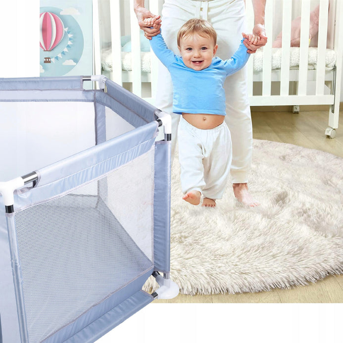 Acest tarc de siguranta este un cadou excelent pentru copii. Tarcul de joaca portabil are peretii din plasa pentru a-l putea supraveghea pe cel mic, pentru ventilatie si este perfect pentru utilizare in interior si exterior (gradina, balcon sau terasa). Usa cu fermoare asigura acces usor. Include 2 inele de sustinere cu manere de prindere de care se pot atasa jucarii sau pot fi folosite de bebelusi/copii ca elemente de ajutor pentru a se ridica.