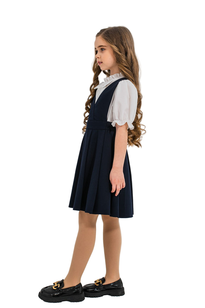 Modelul de sarafan Adelaide aduce eleganta si confort in garderoba scolara. Realizat din stofa de calitate cu textura fina, are croiala evazata cu pliuri ample in partea de jos pentru libertate de miscare. Decolteul in V pune in valoare camasile sau bluzele albe, iar banda ajustabila subliniaza talia. Captuseala din bumbac aduce un plus de confort, iar lungimea pana sub genunchi pastreaza un aspect clasic si rafinat. Este o piesa versatila si comoda pentru scoala sau evenimente care necesita o tinuta tip uniforma. Bretelele late si decolteul amplu il fac usor de asortat cu camasi, bluze cu guler sau malete/helanci.