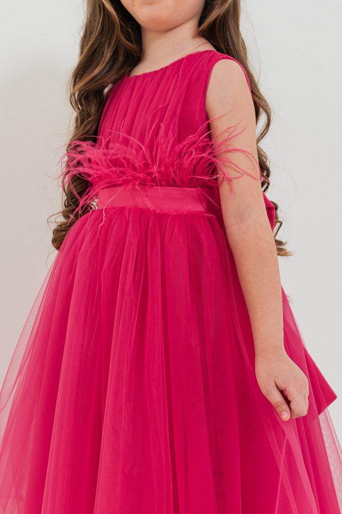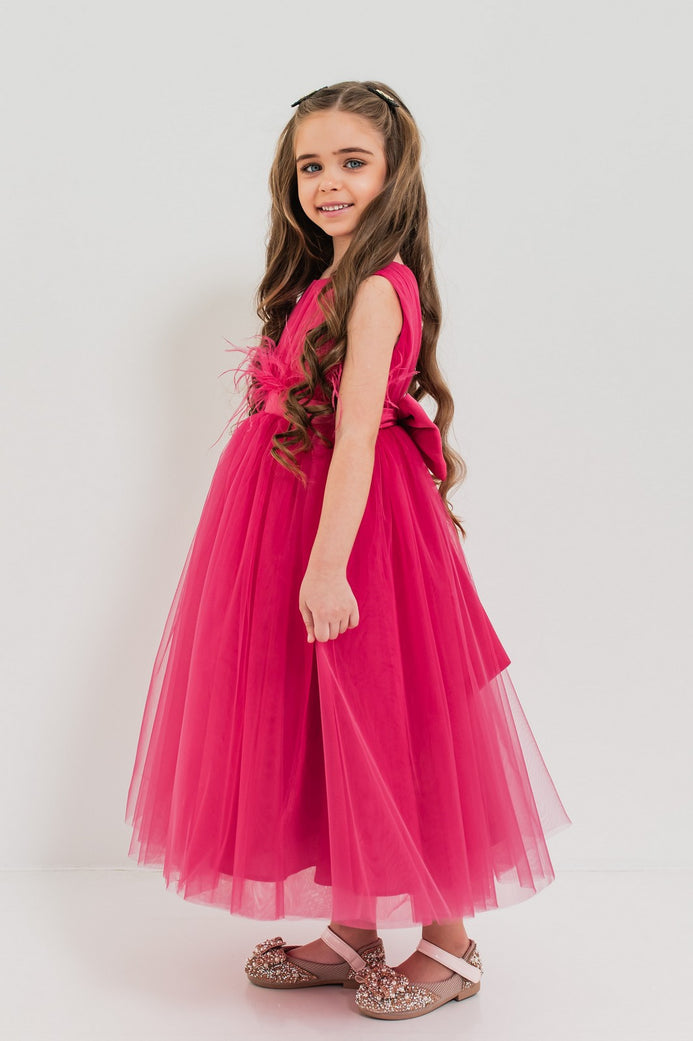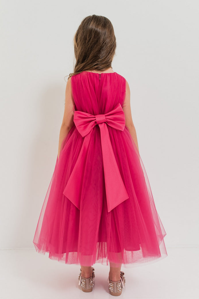 JASMINE – Rochita de ocazie din tulle fin cu saten si drapaje cu funda decorativa, fuchsia
