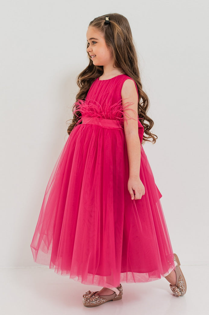 • Detalii adorabile: talia este accentuată de o bandă cu pene și fundă mare la spate, oferind un plus de eleganță;
