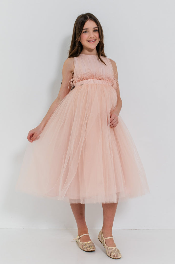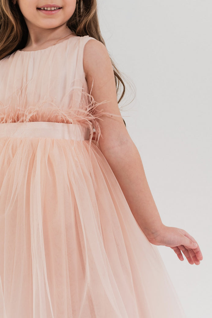 • Detalii adorabile: talia este accentuată de o bandă cu pene și fundă mare la spate, oferind un plus de eleganță;