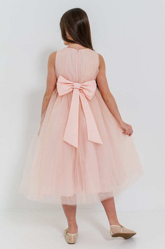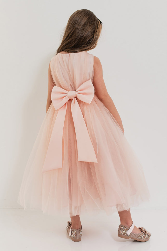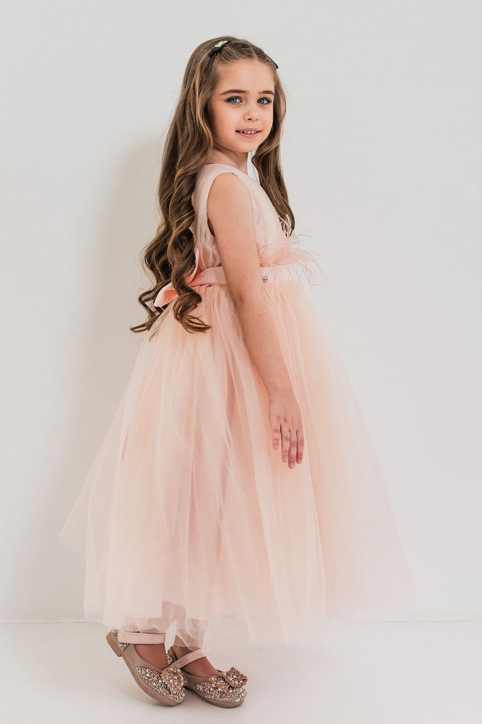 JASMINE – Rochita de ocazie din tulle fin cu saten si drapaje cu funda decorativa, piersica