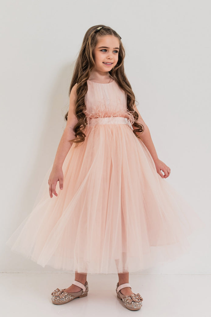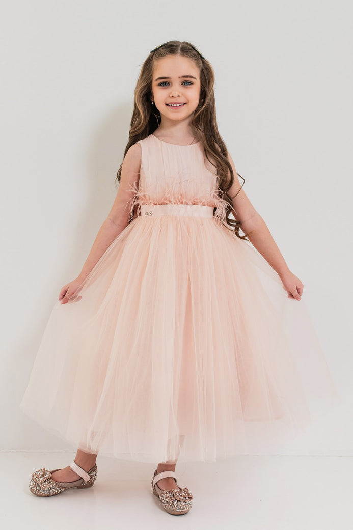 Tulle fin, detalii drapate și un accesoriu elegant în talie – rochia Jasmin este alegerea perfectă pentru micile domnișoare care doresc să strălucească la fiecare eveniment! Un model diafan, realizat cu grijă din materiale premium care oferă confort și rafinament. Rochia este semi-cambrată și are croială amplă, în cloș, cu lungimea fustei până deasupra gleznelor. Corsetul este decorat cu drapaje fine din tulle care adaugă un plus de rafinament ținutei. Linia taliei este accentuată de o bandă din satin cu pene decorative (detașabilă), completată de o fundă care evidențiază frumos silueta. Fusta compusă din cinci straturi de tulle, oferă volum spectaculos iar stratul de saten oferă un plus de strălucire și o notă festivă.