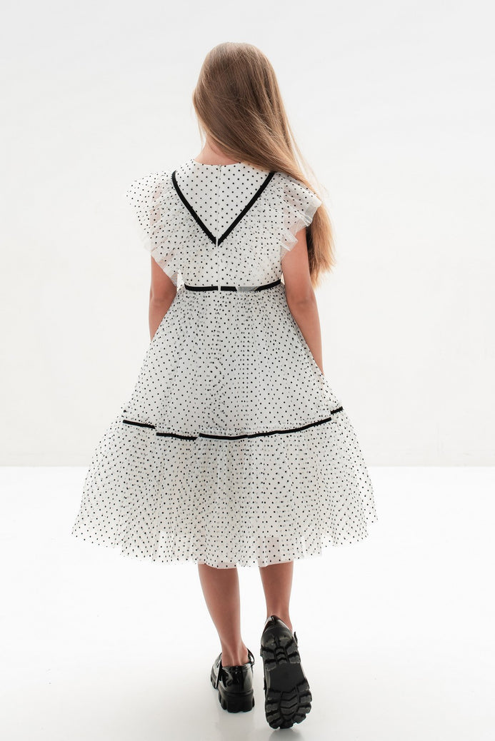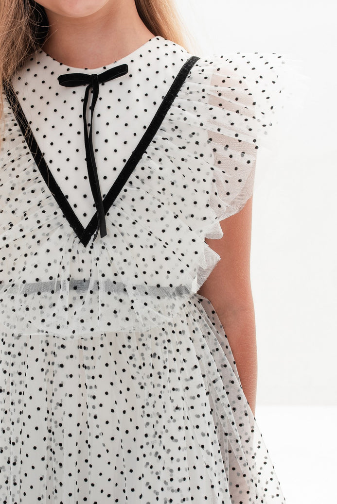 - Elemente elegante: volane din tulle cu buline negre completate cu bordură decorativă din catifea neagră la guler, bust și fustă.