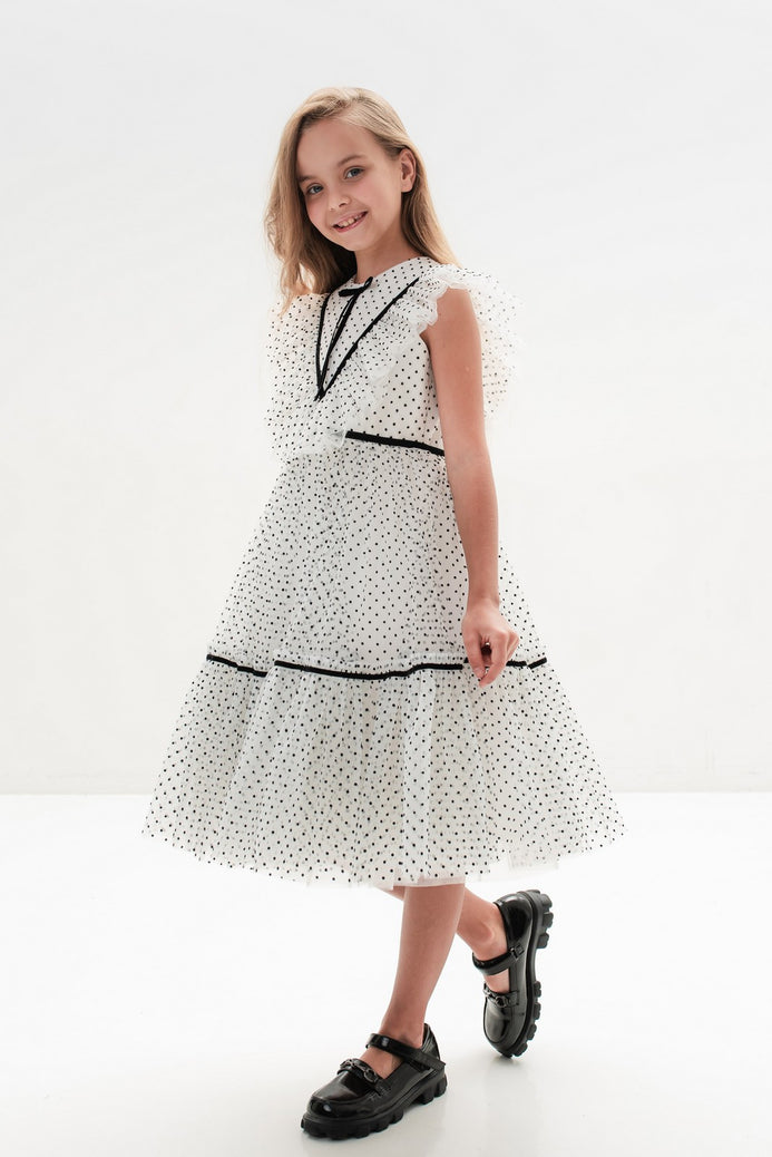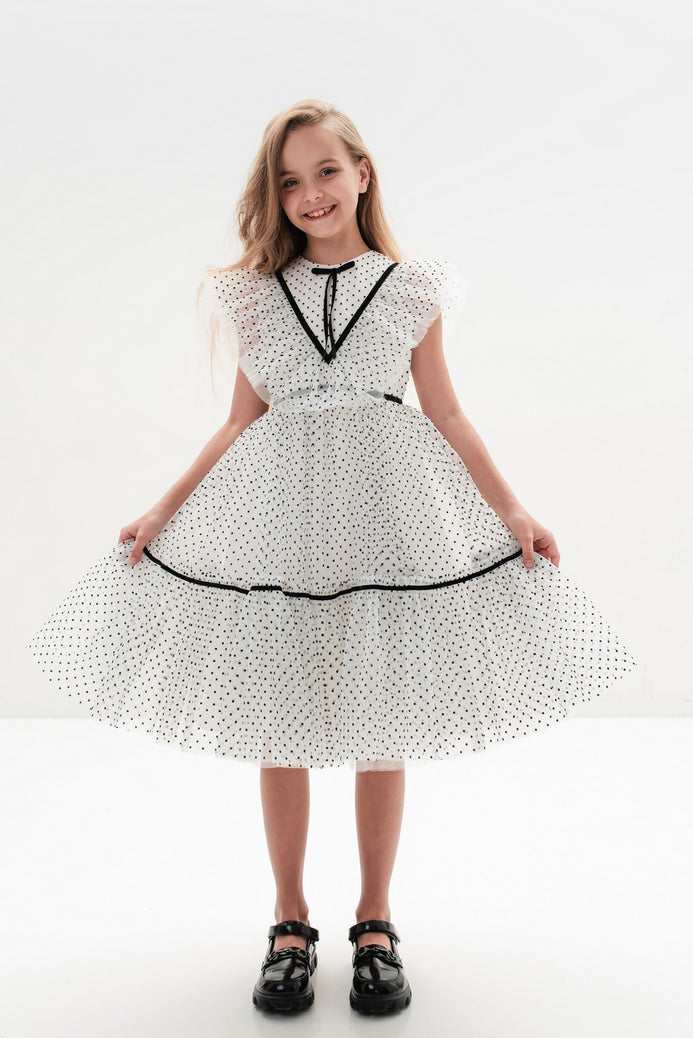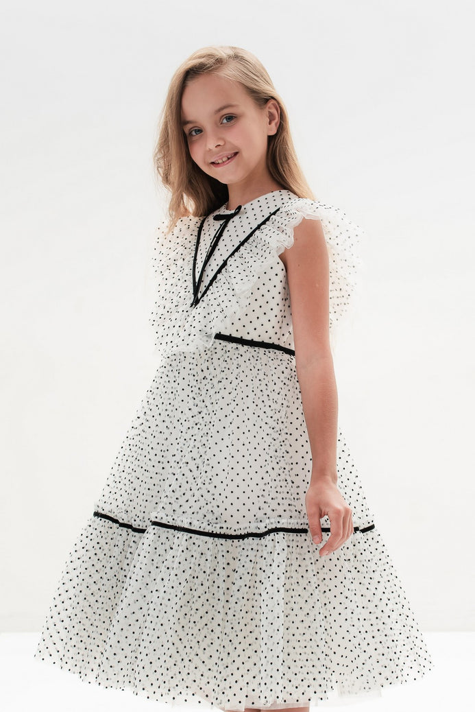 ODALYS – Rochie eleganta din tulle fin cu volane, buline si panglici din catifea, alb