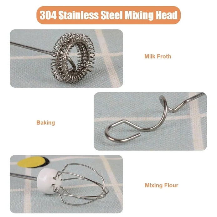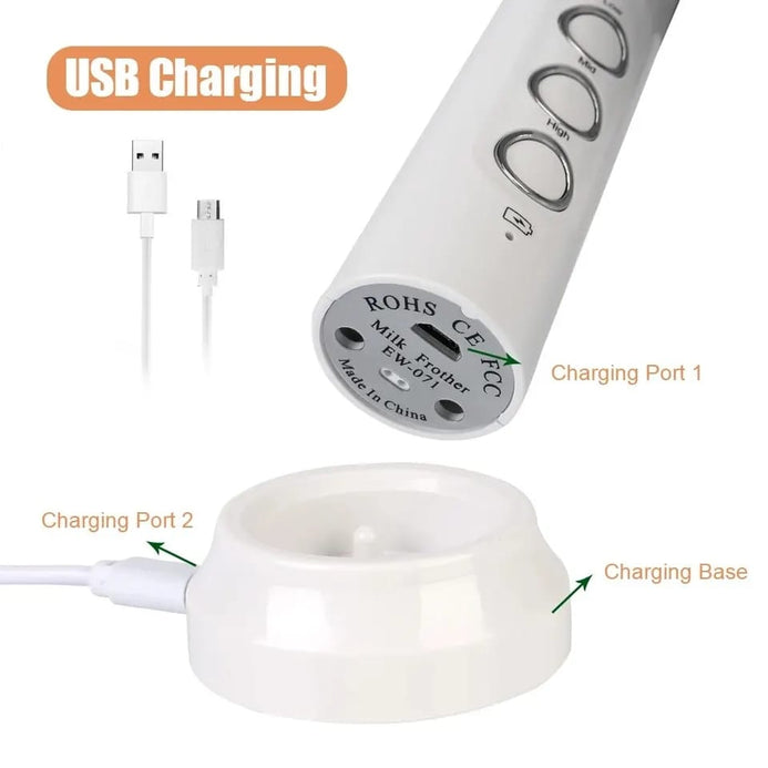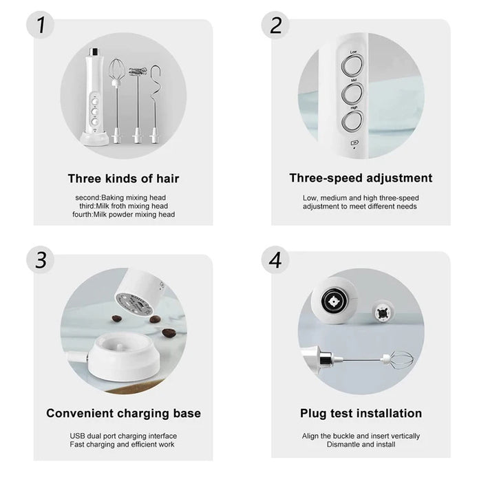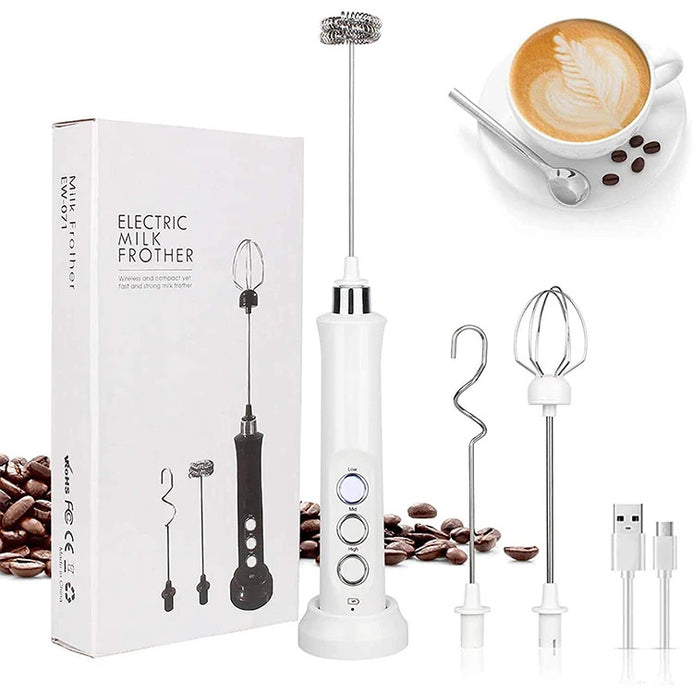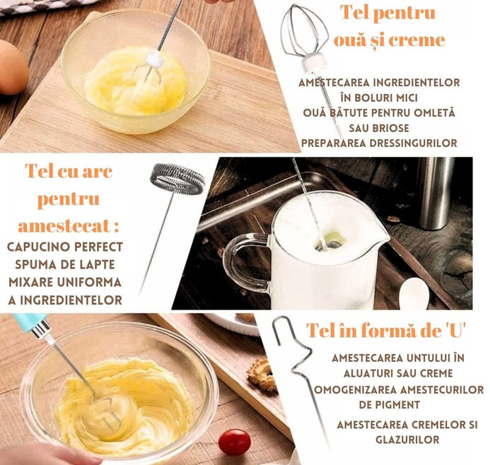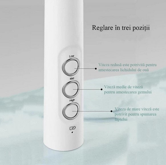 Mixer spuma lapte cu 3 teluri interschimbabile, incarcare wirless si acumulator incorporat, 3 trepte de viteza pentru spumare, frappe, cappucino, mixat oua, alb