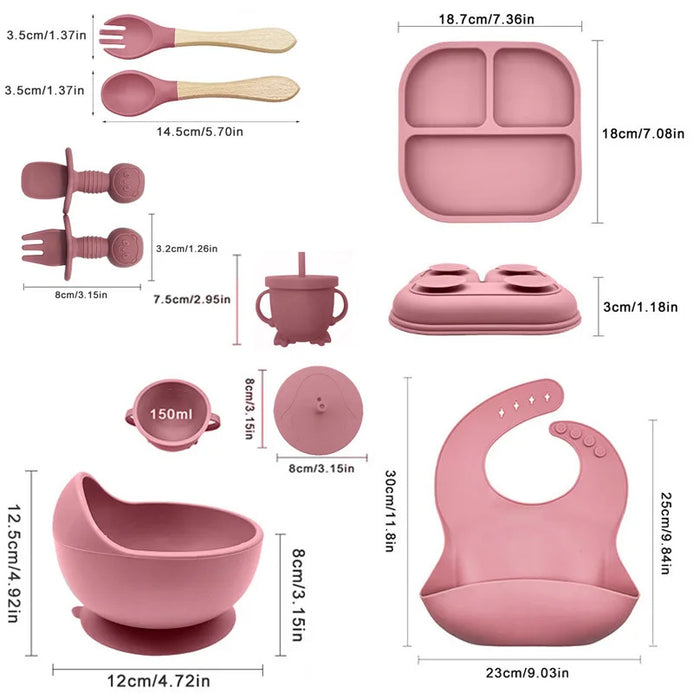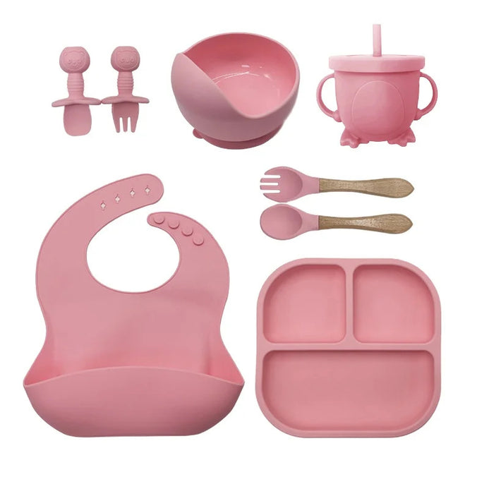 Set 8 piese hranire bebelusi pentru diversificare, farfurie si bol cu ventuze, cana cu capac si pai, lingurita, furculita, baveta din silicon, Roz