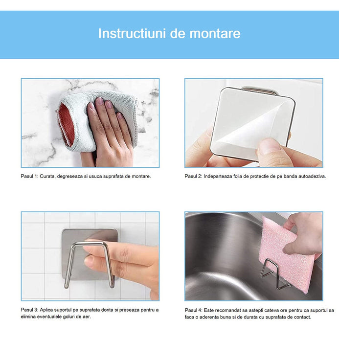 Fabricat din inox de inalta calitate, suportul este rezistent la apa, rugina si zgarieturi. Finisajul sau cromat este usor de curatat si de intretinut. Datorita modelului cu carlig deschis, buretele/laveta/accesoriile de curatenie se pot scurge si usca rapid. Suportul organizator include banda autoadeziva 3M cu fixare sigura, durabila si usoara. Aceasta ii permite prinderea pe multiple suprafete (netede) cum ar fi: sticla, ceramica, marmura, inox, metal, lemn, PVC. Sustine o greutate de pana la 3.5 kg si are multiple intrebuintari in baie, bucatarie sau hol: suport pentru burete de bucatarie, burete de baie, textile, accesorii de curatenie, ustensile de bucatarie, servetele, sticle, recipiente, reviste, umbrele, brelocuri, decoratiuni, etc.