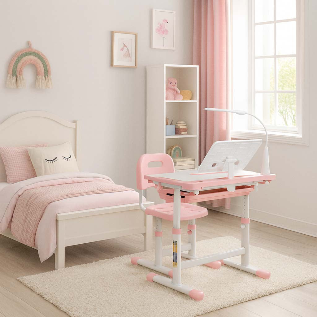 Birou scolar reglabil cu scaun ergonomic si lampa LED USB pentru copii, roz