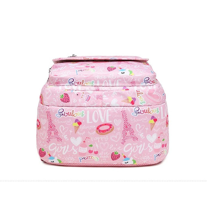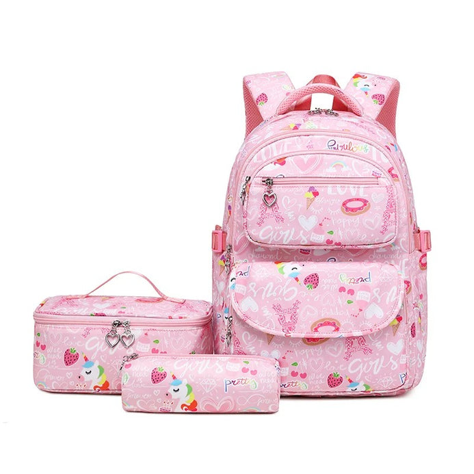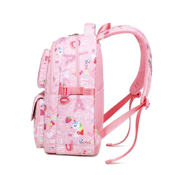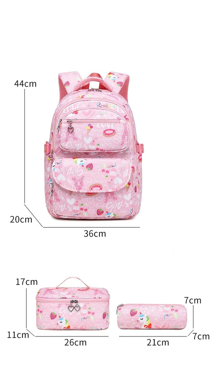 Ghiozdan de fete pentru scoala cu multiple compartimentele, impermeabil, penar si recipient mancare termoizolant, Roz