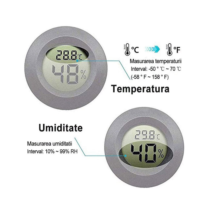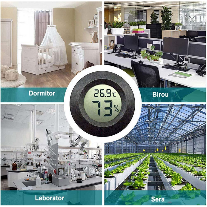 Higrometrul si termometrul digital este dispozitivul ideal pentru a masura umiditatea si temperatura aerului din incaperi. Termohigrometrul digital este potrivit pentru camerele copiilor, birouri, depozite, farmacii, saloane de infrumusetare sau pentru orice spatiu in care se doreste monitorizarea temperaturii si a umiditatii aerului. Aparatul are un design minimalist, compact, cu afisaj digital in format mare pentru temperatura si umiditate. Se poate amplasa pe orice piesa de mobilier/birou sau se poate incastra in mobilier/perete. De asemenea, datorita dimensiunilor reduse, este si portabil.