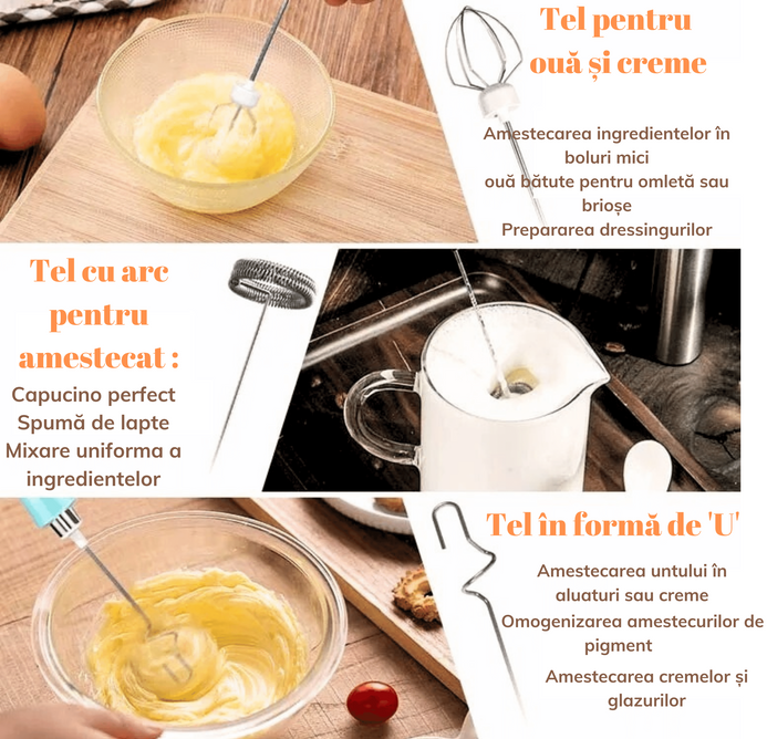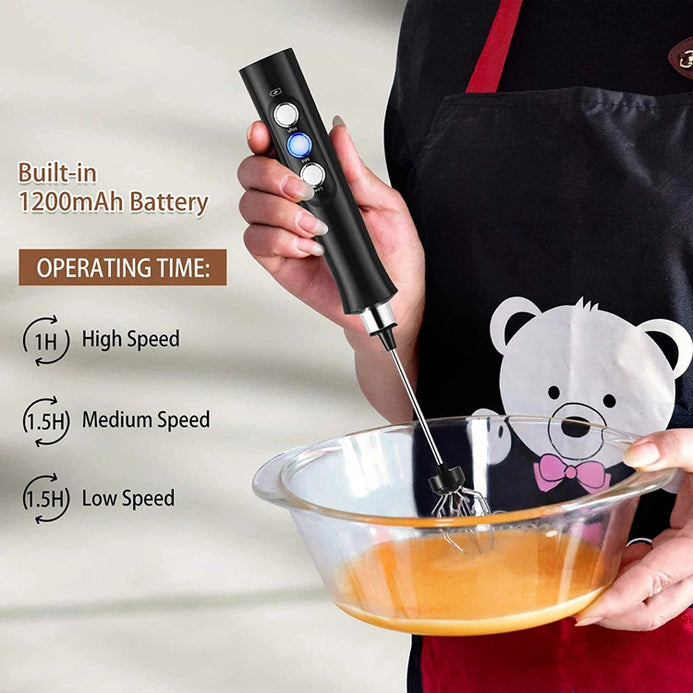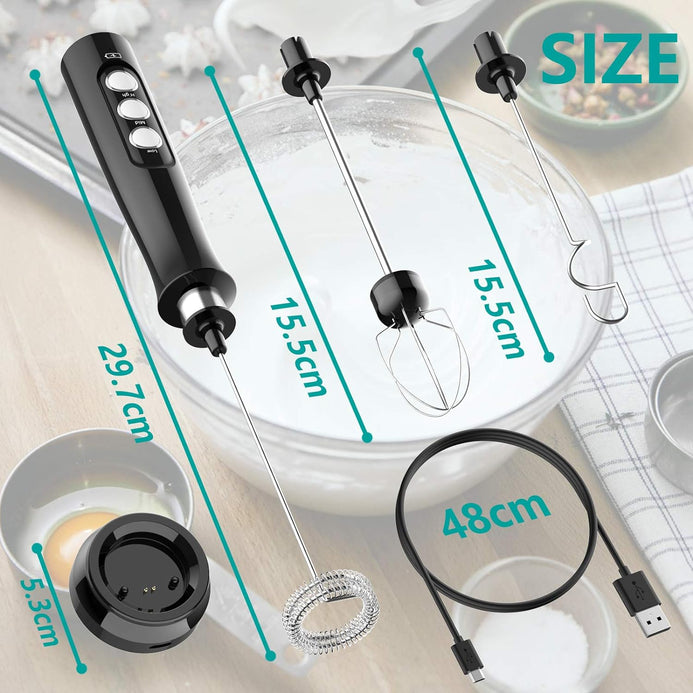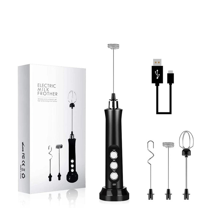 Mixer spuma lapte cu 3 teluri interschimbabile, incarcare wirless si acumulator incorporat, 3 trepte de viteza pentru spumare, frappe, cappucino, mixat oua, negru