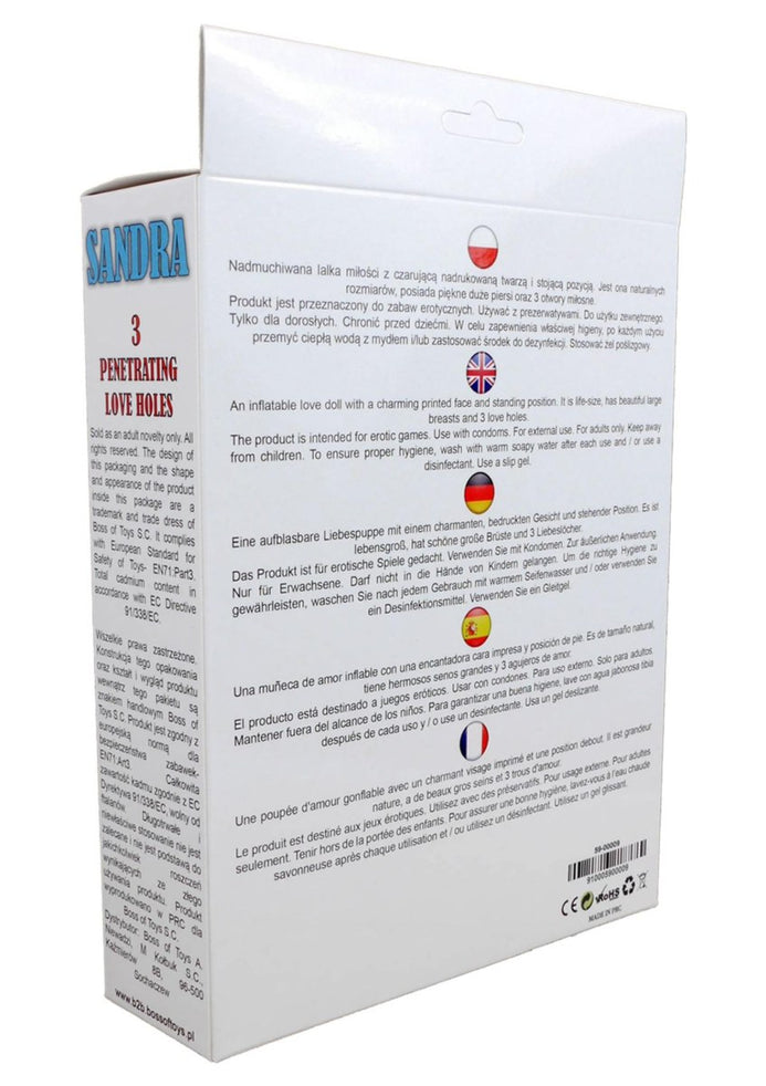 Păpușă gonflabilă Sandra – experiență erotică de neuitat si plăcere în orice moment. O păpușă gonflabilă în mărime naturală, cu sâni voluptuoși și 3 orificii intime pentru satisfacția ta maximă. Perfectă pentru cei care vor să-și exploreze fanteziile într-un mod discret și plăcut. Designul său realist o face perfectă pentru momente de răsfăț senzual.