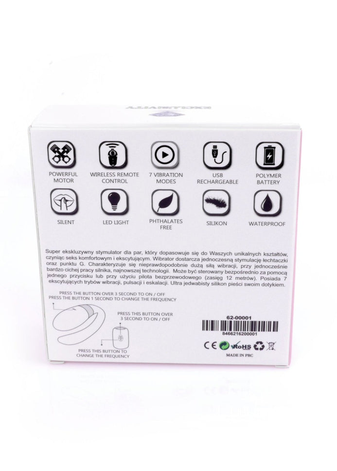 Se caracterizeaza printr-o forta de vibratie incredibil de mare, cu o functionare foarte silentioasa a motorului, tehnologie de ultima ora. Poate fi controlat direct cu un singur buton sau folosind o telecomandă wireless (rază 12 metri). Are 7 moduri interesante de vibrație, pulsație și escaladare. Siliconul ultra matasos mangaie cu atingerea sa. Incărcarea se realizează prin cablu USB (inclus).