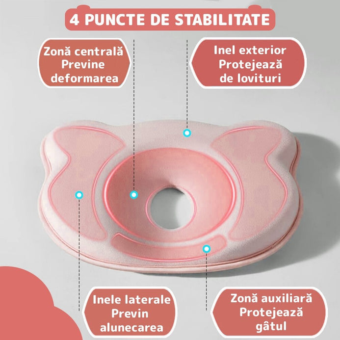 - Design Ergonomic: Forma special conceputa a pernei ajuta la mentinerea aliniamentului corect al capului si gatului, contribuind la dezvoltarea sanatoasa a bebelusului.