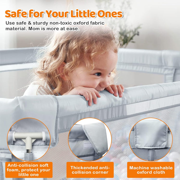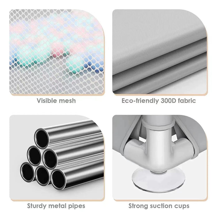 Acest tarc de siguranta este un cadou excelent pentru copii. Tarcul de joaca portabil are peretii din plasa pentru a-l putea supraveghea pe cel mic, pentru ventilatie si este perfect pentru utilizare in interior si exterior (gradina, balcon sau terasa). Usa cu fermoar asigura acces usor. Cadrul superior din aluminiu este prevazut cu protectii moi (anti-accidentari) iar cadrul inferior (baza) este prevazuta cu 4 ventuze de prindere/fixare pentru podea.