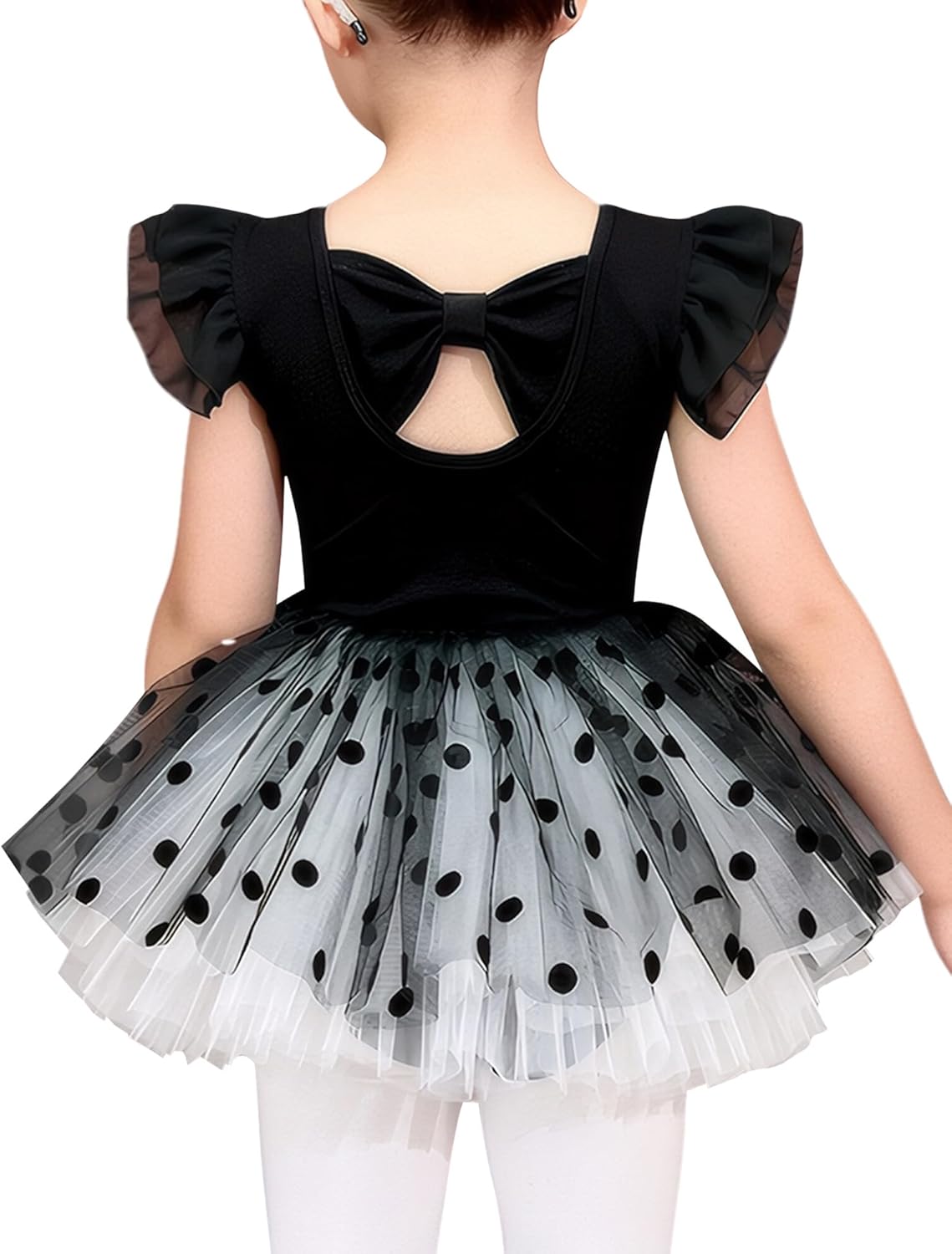 Set costum balerina fetite: body negru cu volane si fundita, fusta tutu cu buline – perfect pentru dans, gimnastica, spectacole.