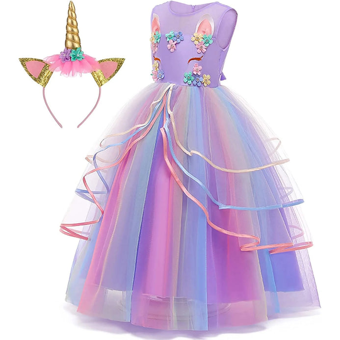 Rochie printesa Unicorn cu accesorii pentru fetite costumatie joc de rol petreceri, serbari, carnaval si cadou ideal pentru sarbatori, aniversari sau zile de nastere, mov/multicolor