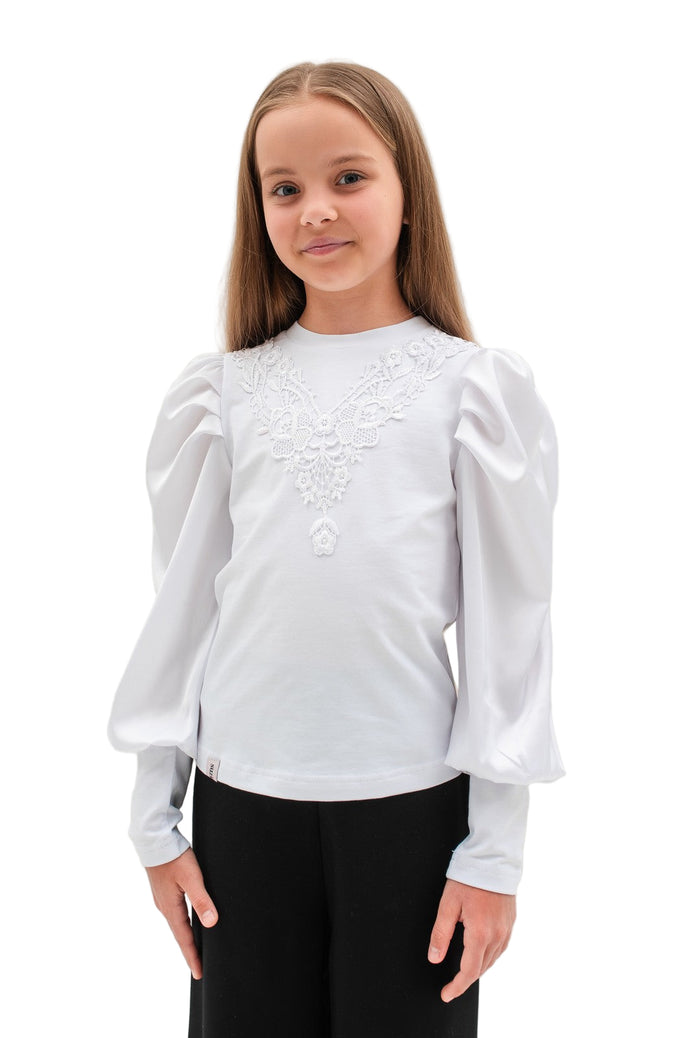 Confectionata din materiale premium, are maneci lungi bufante din satin si o aplicatie eleganta din dantela florala in zona bustului. Este un model perfect pentru fetitele care iubesc detaliile rafinate. Decolteul rotund si croiala lejera o fac ideala pentru a fi purtata cu fuste sau pantaloni eleganti. Este o alegere inspirata pentru tinute scolare deosebite, pentru evenimente festive dar si pentru cele de zi cu zi. Fiind o piesa versatila, se poate completa cu sacou, trenci sau palton.