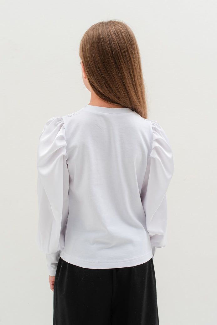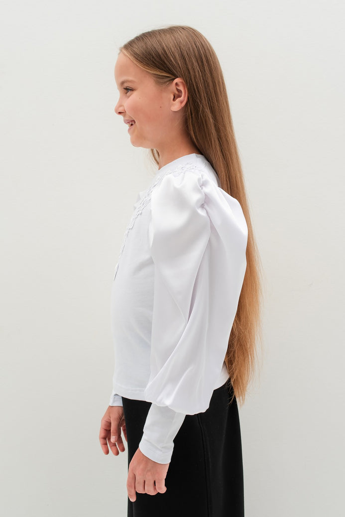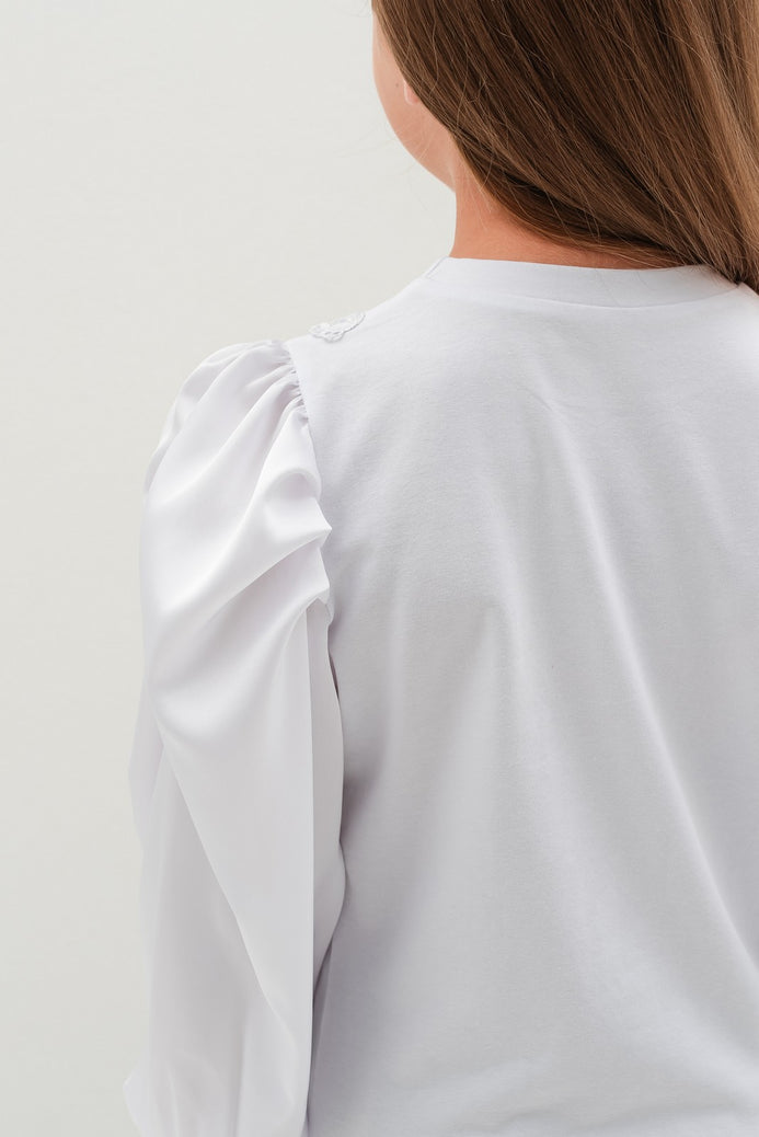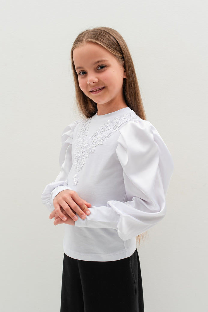 Bluza alba din bumbac cu dantela si maneci bufante din satin este ideala pentru tinute elegante sau pentru un plus de stil la uniforma scolara.