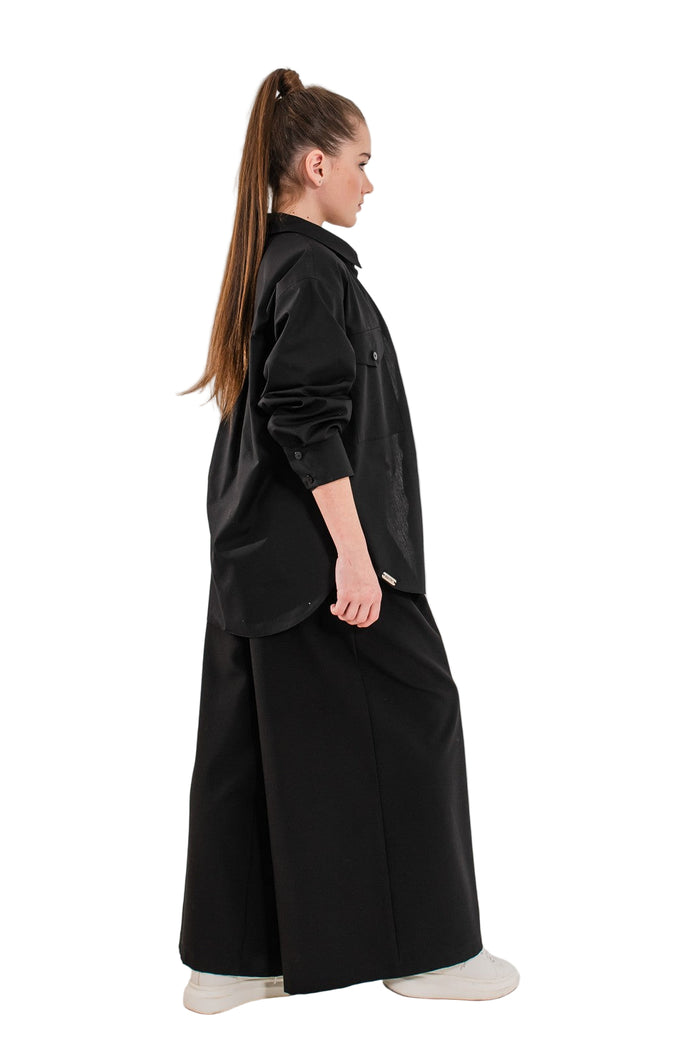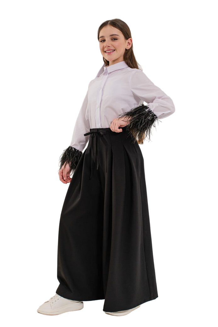 Acest model aduce un aer modern si sofisticat tinutelor scolare. Cu o croiala ampla de tip Palazzo (wide) si pliuri fine in partea superioara, acesti pantaloni cu talie inalta sunt atat confortabil, cat si eleganti. Sunt realizati din stofa premium cu cadere frumoasa si au cordon subtire decorativ in talie. Pot fi purtati cu camasi, bluze, sacouri sau veste si sunt perfecti pentru uniforme moderne de scoala sau evenimente.