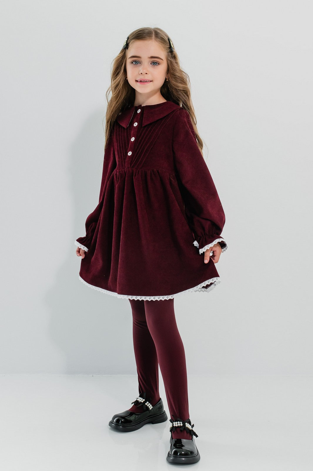 Rochie din catifea reiat cu guler clasic, nasturi frontali si fusta semi-evazata cu insertie din dantela. O alegere versatila si confortabila pentru scoala, tinute de zi cu zi sau pentru evenimente speciale.