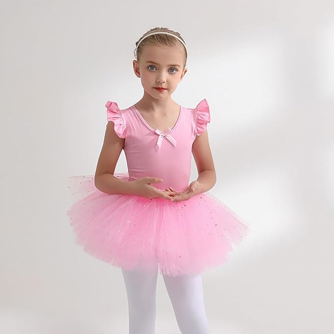 Set costum balerina fetite: body roz cu volane si fundita, fusta tutu stralucitoare cu strasuri – perfect pentru dans, gimnastica, spectacole.